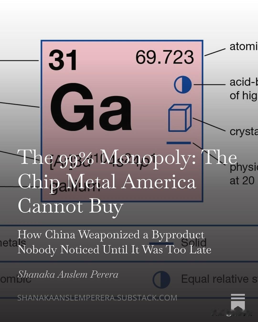 精炼镓99%垄断,中国刚刚证明,一个文件柜就能让美国失去空中优势。 无人能将以下数字联系起来: →中国控制着99%的精炼镓产量 →美国产量正好为0% →最后一家美国工厂于1987年关闭。 →这是长达38年的战略忽视。 F-35战斗机的雷达。爱国者导弹系统。所有5G基站。所有电动汽车快速充电桩。所有人工智能数据中心。 一切都取决于来自一个对手的同一种材料。 2024年12月:中国禁止向美国出口商品。2025年11月:禁令“暂停”至2026年11月27日。 这并非缓和局势。 这是一场演示。 北京已经证明,它可以先改变方向,然后再改变方向,然后再改变方向。 五角大楼披露,78%的武器系统使用了来自中国的关键矿物。涉及1900个平台和8万个零部件。 美国的战略性镓储备? 零。 竞相建设西方供应设施的项目要到 2028-2029 年才能达到规模。 该暂停令将于2026年11月到期。 算算就知道了,差距不可能缩小。 到2026年第四季度,至少会有一份大型国防合同因镓元素问题而延期。 这不是供应链问题。 这是权限架构。 现在,中国控制着谁能研发先进技术。 北京长安大街上的档案柜里,珍藏着美国半导体行业的未来。