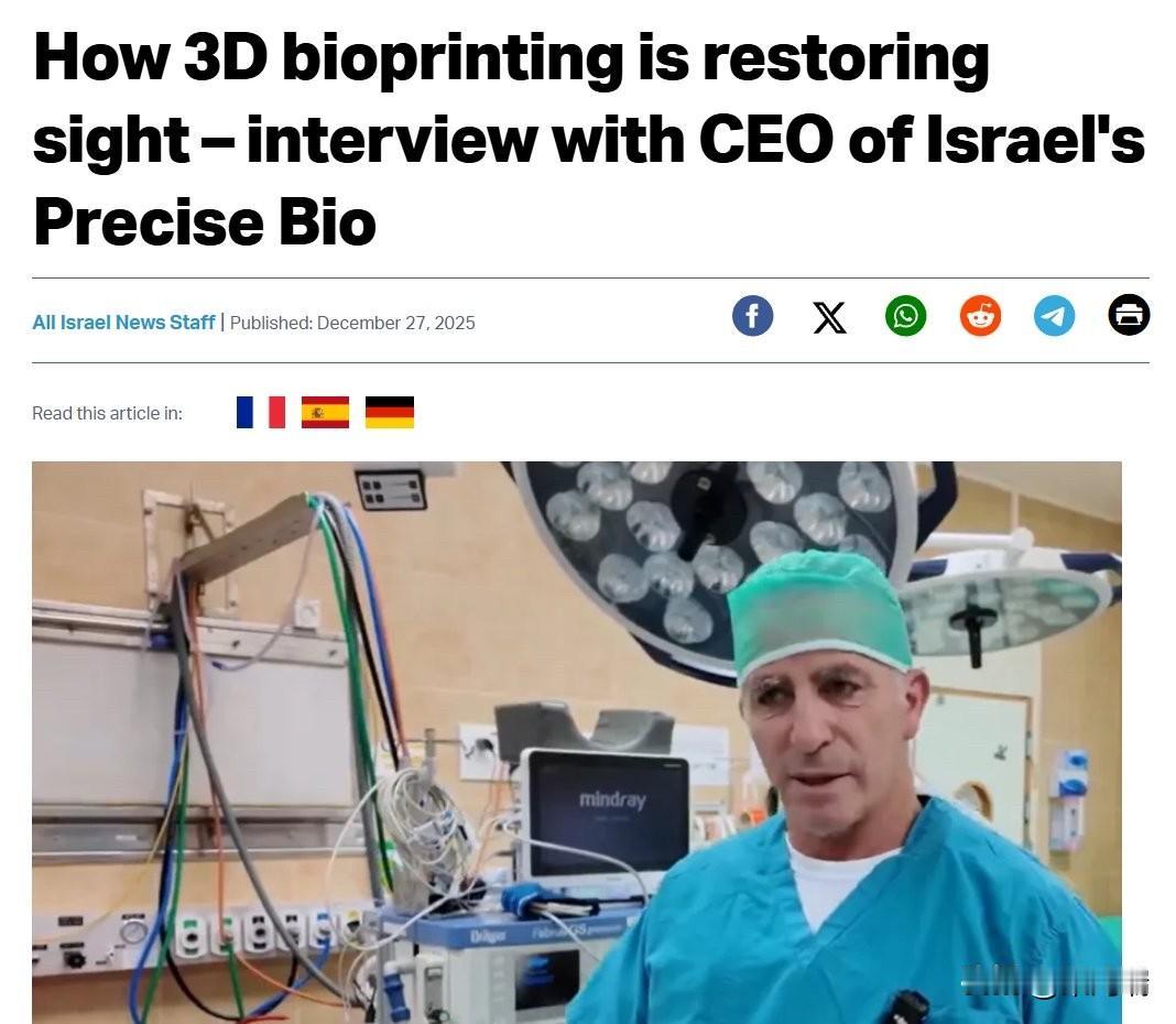 Precise Bio,一家以色列生物技术公司使用 3D 生物打印技术生产活体人类角膜组织。成功将全球首个完全由人类细胞在实验室培育的 3D 打印角膜植入一名合法失明患者的眼中,并恢复了其部分视力。 这一创新解决了全球角膜捐献者短缺的关键问题,因为单个捐献的角膜样本可以培育出数百个植入物。 受访人: Precise Bio 的联合创始人兼首席执行官 Aryeh Batt(阿里耶·巴特)确认以下信息: 他们的科学家利用活体人类角膜细胞,通过 3D 生物打印机将其排列成一个功能性角膜,然后将其移植到一位法定盲人女性体内。 组织已整合。 眼睛接受了它。 视力恢复了。 没有可供捐献的角膜。 没有尸体组织。 真正的临床监管。