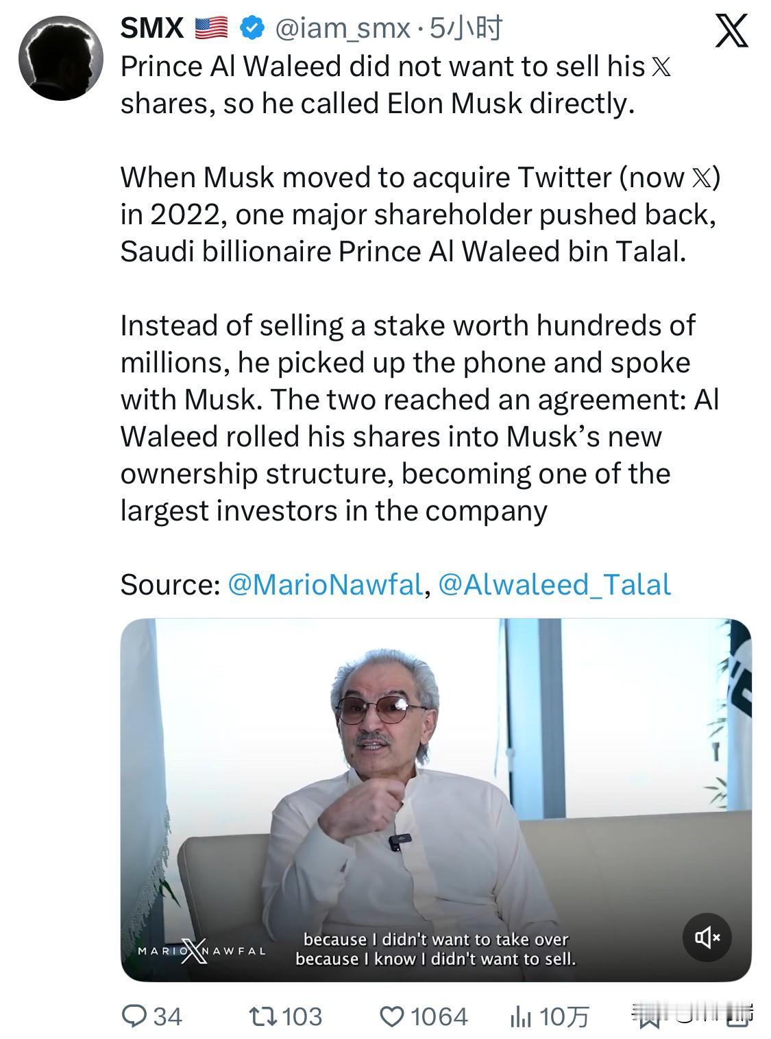 2022 年 4 月,当马斯克提出以每股 54.20 美元的价格收购 Twitter 时,阿尔瓦利德王子在 Twitter 上公开拒绝,称该报价并未接近 Twitter 考虑到其增长前景后的内在价值,并表示作为最大的长期股东之一,他将投反对票。 在与马斯克进行私人沟通后,王子的态度发生了 180 度大转弯。他随后在推特上称赞马斯克是“𝕏 的卓越领导者”,并决定将自己持有的股份转入马斯克的私有化公司。 这确实是马斯克收购 Twitter(现为 𝕏)过程中一个关键的转折点。阿尔瓦利德王子通过其控制的王国控股公司 (Kingdom Holding Company) 进行了转股。根据监管文件,他投入了约 3500 万股 Twitter 股票,价值约 19 亿美元。 目前的地位:这笔交易使他成为 𝕏 仅次于马斯克的第二大股东。尽管公司更名为 𝕏 后估值大幅缩水,但王子在公开采访中多次表示,他对这项长期投资及其与马斯克的合作感到满意。