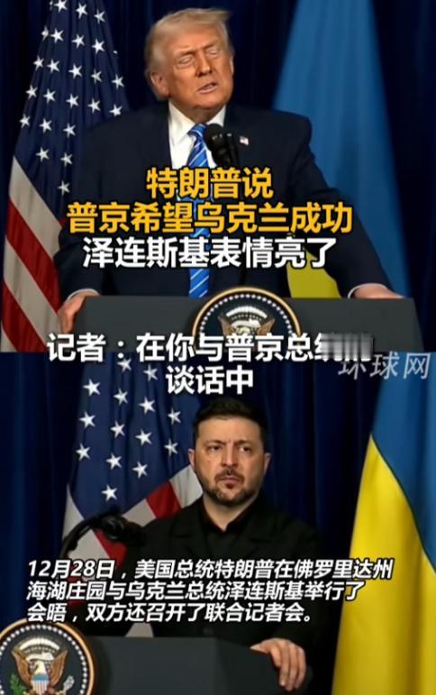 昨天佛罗里达海湖庄园的记者会刚开场,特朗普一句话就让全场的目光都黏在泽连斯基脸上了。 俩人刚结束私下碰头,一坐进发布会现场,特朗普没绕弯子就抛了个话:“我刚跟普京聊了1小时15分钟,他其实是盼着乌克兰能成事儿的。” 甚至还补了句“泽连斯基和普京都想赶紧把冲突停了,普京对和平这事儿是真走心”。 这话一落地,镜头正好怼着泽连斯基,那脸唰地一下就有点僵,眼神里那股“这台词我没彩排过”的懵劲儿,直接被镜头拍了个正着。 那表情说不上是尴尬还是意外,反正明眼人都看出来,他这反应是真没提前跟特朗普对过。不少蹲直播的网友当场乐了:“隔着屏幕都能感觉到他脚指头在鞋里疯狂动工”。 其实俩人这次凑一块儿,核心是聊俄乌那“20点和平计划”,特朗普说这计划俩人已经捋顺了95%的内容,就卡在顿巴斯那片领土的事儿上。 这可是块谁都不肯松口的硬骨头,但他也补了句,领土相关的谈法也定了九成,就差最后那点磨嘴皮子的功夫。 另外美乌还要签个安全协议,说是已经摸到“最后一步”的门槛了。 不仅如此,他还透了个底会后会再给普京打个电话,顺便联系欧洲那边的负责人搭个桥,甚至没排除以后美、俄、乌三伙人坐一块儿谈的可能。 说到底,这次海湖庄园的碰头算是把俄乌和平的事儿往前拱了拱,和平计划大半定了,安全协议也快落停,但领土这道坎儿还没迈过去。 后续这事儿能不能真落地,估计大伙儿都盯着呢,毕竟狠话好说,真把冲突按住了才是真有用。