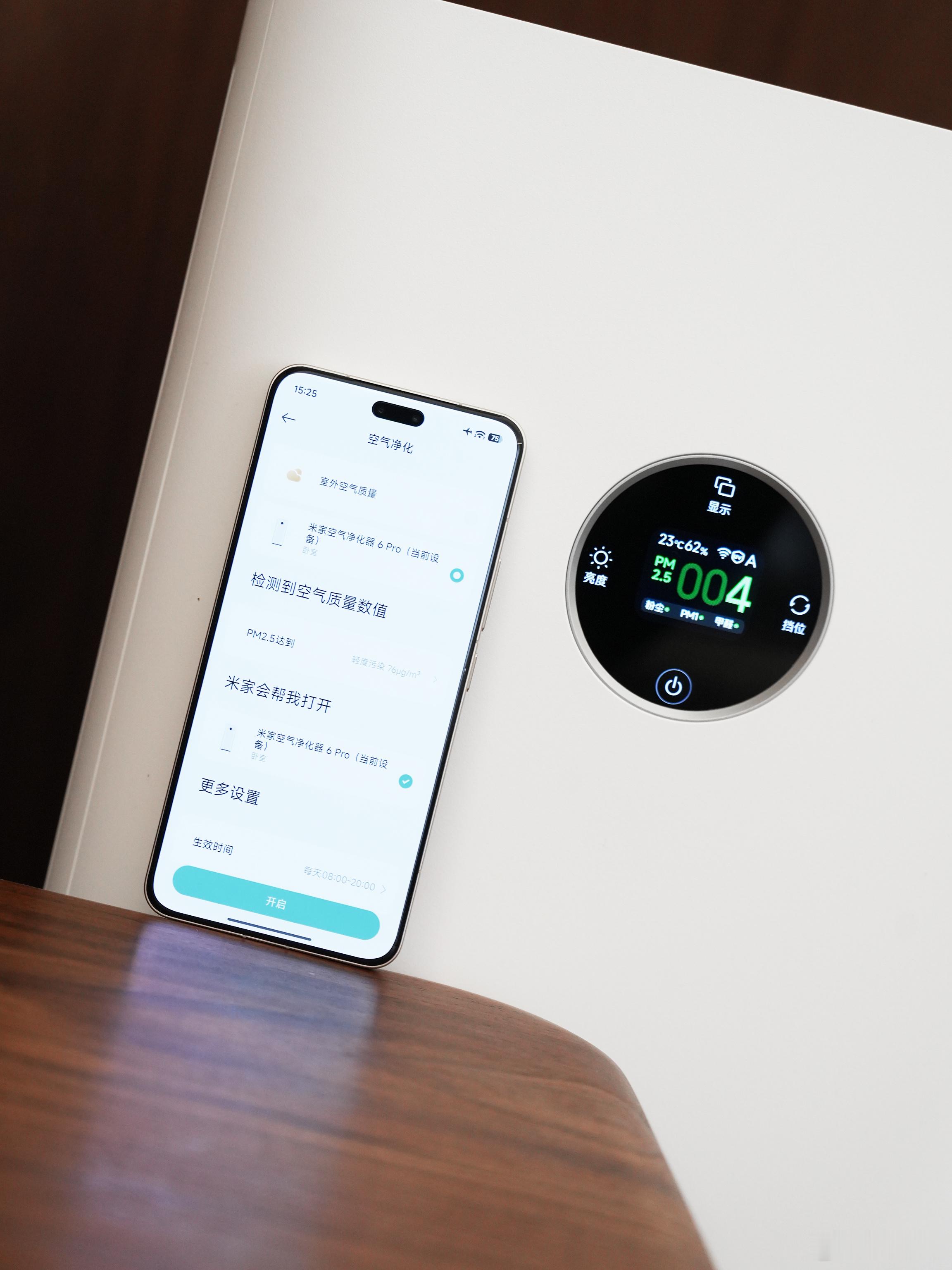 米家空气净化器 6 Pro,依然是大家熟悉的米家白色外观风格,简洁好看,放在家中的任何角落都很和谐它是首款高性能1级能效米家空气净化器,创新双芯双效架构,同时满足除醛和净化空气。甲醛1小时去除率99%,1.5分钟即可焕新整屋空气,性能非常好。而且刚刚说了它是1级能效,高性能还省电省钱,经济性也不错运行时睡眠档噪音32dB左右,有一点声音但不大,睡觉时是可以使用的,2999的起售价,同档性价比很高了