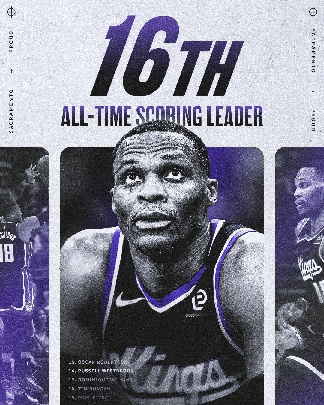 威少再次刷新记录,生涯总得分升至历史第16 在刚刚结束的湖人以125-101战胜国王的比赛中,威少全场17中6得到13分,目前生涯得到26672分。26672分,超越多米尼克-威尔金斯(26668分)升至历史第十六位,距离奥斯卡-罗伯特森(26710分)还差38分