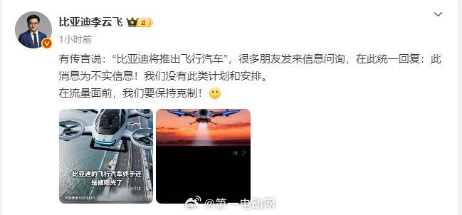 比亚迪集团-品牌及公关处总经理李云飞对外澄清,有关比亚迪将推出飞行汽车的传言为不实信息,公司目前并无此类计划和安排 比亚迪推出飞行汽车消息不实新能源汽车