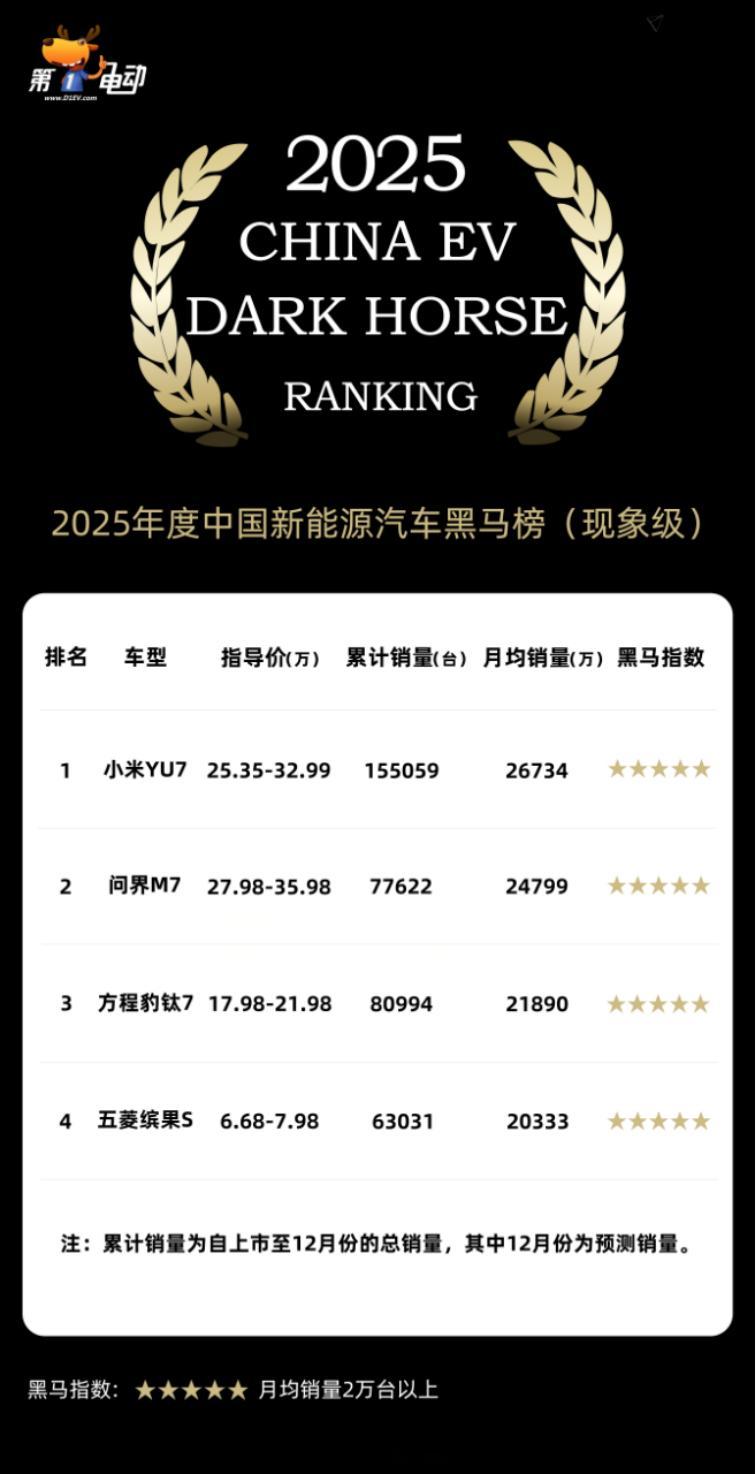 【2025 年新能源黑马榜现象级:只诞生了 4 款“现象级”车型】新能源汽车黑马榜 在 2025 年,新能源市场一共上市 130+ 款新车。真正做到月均 2 万台以上的,只有 4 款:小米 YU7(20–30 万)小米YU7 问界 M7(30 万级)全新问界M7 方程豹 钛7(15–20 万)方程豹钛7 五菱 缤果S(5–10 万)五菱缤果S 一个很残酷的事实是:👉 现象级不是“爆款加强版”,而是直接改写细分市场结构。这 4 款车,定位、价格、技术路线完全不同,但有一个共同点:它们都在各自价格带,精准吃掉了“最大公约数用户”。小米 YU7:把性能、设计、智能、性价比压到 25–30 万区间极限问界 M7:第一次在 30 万内,把华为体系的品牌势能彻底释放方程豹钛7:用“家用 + 轻越野”重做一个原本小众的方盒子市场五菱缤果S:在消费降级背景下,把 A0 级纯电做到“安全 +便宜”这也解释了为什么:👉 一年 130 款新车,只有 4 款能跑到现象级。不是大家不努力,而是只有极少数车型,真正踩中了价格带、用户情绪和成本结构三件事的交集。全文指路👉:网页链接你觉得这 4 款里,哪一款最不可复制?下一款“现象级”,你心中有候选了吗?新能源汽车