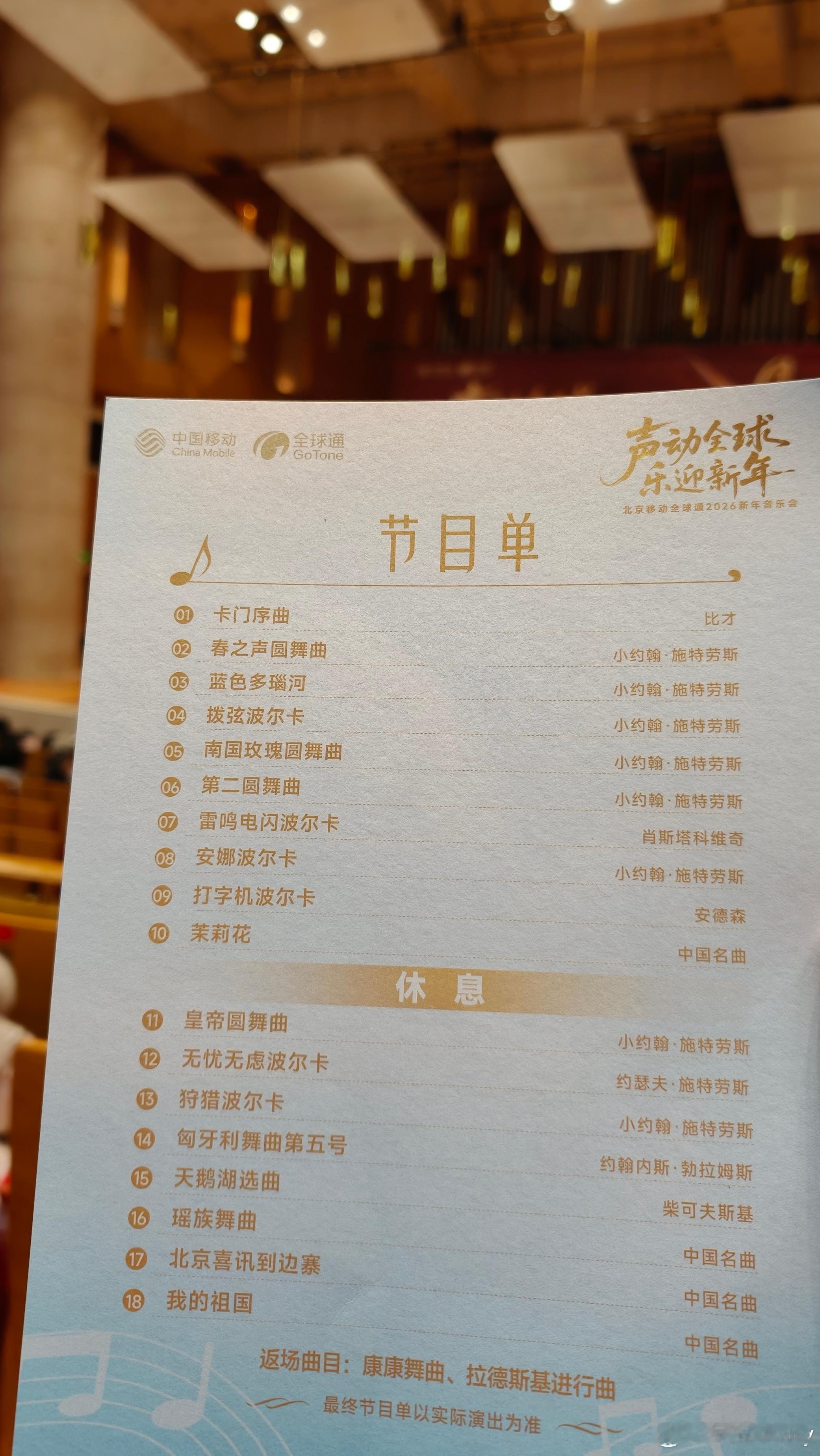 全球通2026新年音乐会,真是让我这个从小学音乐的孩子又回味了一把音符的快乐经典的卡门开篇之后,用《春之声圆舞曲》《蓝色多瑙河》致敬小约翰·施特劳斯诞辰200周年。下半场柴可夫斯基的天鹅湖选章后进入中国名曲,《我的祖国》压轴,完美!桐学会音乐会