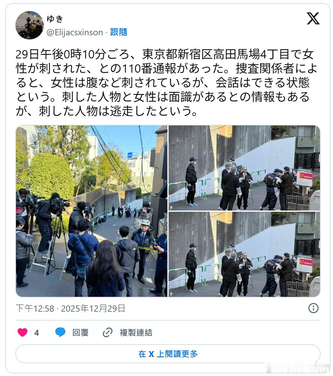 【东京发生街头持刀袭击事件!30多岁女子遭刺多刀倒地 外籍男子行凶后逃逸】海外新鲜事日本 日本东京都新宿区29日中午发生一起持刀袭击案件,一名30多岁的女子在路边遭到一名男子用刀猛刺,身中四刀后倒地。所幸女子送医时仍有意识,警方透露,嫌疑人是外籍男子,作案后立即逃离现场。日媒报道,警方已根据受害人和现场目击者提供的信息,全力追查嫌疑人下落。综合日媒报道,事件发生在中午12时10分左右(北京时间上午11点10分)。警方接到报警称,在距离JR高田马场站约250米的住商混合区,一名女子在路上遭人持刀袭击并倒地。警方赶到现场时,发现受害女子胸部、腹部、手腕等多处受伤,但所幸伤势未危及生命。女子在接受警方询问时称,袭击她的男子是外籍人士。警方表示,受害女子在案发现场附近的一家护肤店工作,袭击她的外籍男子为该店顾客。目击者称,嫌疑人在实施完袭击后独自徒步逃离现场,身穿深色衣物、头戴黑色帽子,背着黑色背包,身高约170厘米。警方初步怀疑嫌疑人与受害人可能存在某种关系,目前正在全力追查嫌疑人行踪。此外,日媒还报道,爱知县名古屋市28日晚发生类似持刀袭击案件。35岁男子在配送货物时,突然遭人从背后用利器攻击,右腰严重受伤,需两周左右才能康复,但所幸没有生命危险。受害男子表示,因遭袭时是从背后被攻击,因此无法看到嫌疑人长相。警方已按照杀人未遂罪方向展开调查,正在追捕逃逸的嫌疑人。图1:日本东京都新宿区在今(29)日中午发生一起持刀攻击案,1名30多岁女子在路边突遭1名男子持刀猛刺。 (图撷取自「日テレNEWS」YouTube)