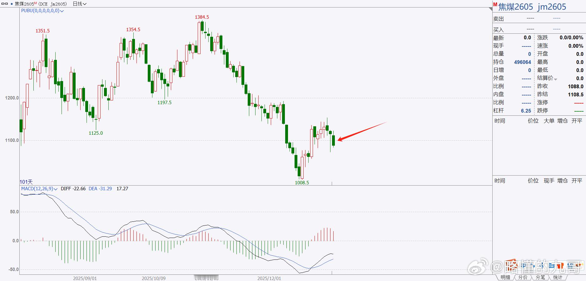 期货 焦煤白天继续收阴线,也符合咱们之前说的震荡走势!目前的重点点位是1073,如果不收大阳线的话,继续下探的概率比较大!回调不做多单,这是交易的基本原则,个人的计划还是要等待焦煤出现做多图形去做多,目前暂时观望!焦煤焦煤