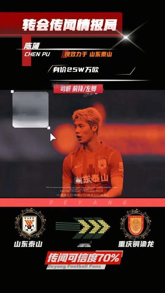陈蒲租借转会重庆铜梁龙? 有足球博主称山东泰山队的陈蒲将租借加盟重庆铜梁龙,山东
