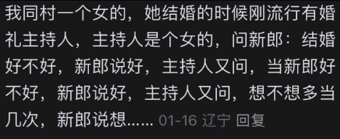 (正常流程应该是:新人祝奶奶健康长寿一鞠躬,新人一边鞠躬一边说着祝福语,拜三次后,奶奶给个红包)结果男方的总管不知道怎么嘴抽抽了,喊的是:"奶奶一鞠躬,奶奶二鞠躬