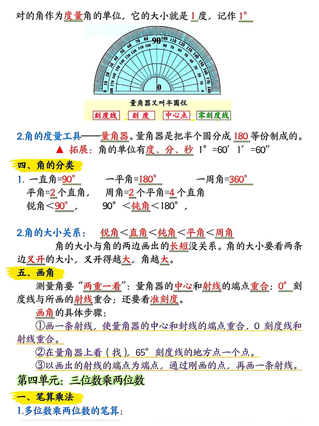 [三R]角的度量:直线 / 射线 / 线段的区别、角的分类(锐角<直角<钝角<平角<周角)、量角画角的 “两重一看” 步骤;