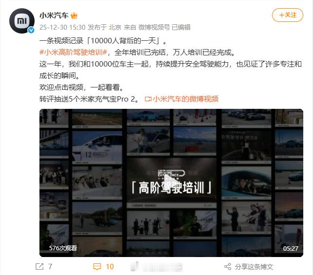【小米高阶驾驶培训1万人目标达成】今日下午,官方微博发布视频,宣布“小米高阶驾驶培训全年培训已完结,万人培训已经完成”。小米高阶驾驶培训是小米汽车为车主提供的封闭场地专业驾驶培训项目,旨在通过极限工况模拟提升安全驾驶技能。