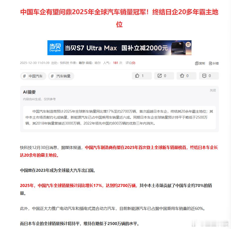 25年中国车企有望问鼎销量冠军快科技12月30日消息,据行业预测,中国汽车制造商将在2025年首次斩获全球新车销量桂冠,终结日本车企长达20余年的市场主导地位。这一里程碑式的转变,标志着全球汽车产业格局迎来重大重构。数据显示,2025年中国汽车全球销量预计同比增长17%,达到约2700万辆,其中国内市场贡献了约70%的销量份额。新能源汽车成为核心增长引擎,目前已占据中国乘用车销量的近60%,成为中国车企突围的关键动力。值得关注的是,中国曾在2023年已跃升为全球最大汽车出口国,为此次销量登顶奠定了坚实基础。反观日本车企,2025年全球销量预计将维持平稳,略低于2500万辆。回顾历史,日本车企曾在2018年创下近3000万辆的销量峰值,2022年仍领先中国车企约800万辆,但这一优势在三年内迅速消失。此前,美国与日本长期占据全球汽车市场主导权争夺的核心位置,而中国车企的崛起将彻底改写这一竞争格局,为全球汽车产业发展注入新的东方力量。中国车企有望终结日企霸主地位