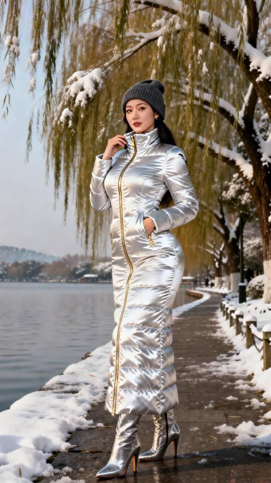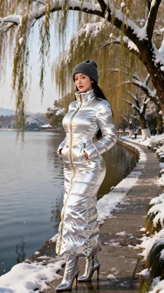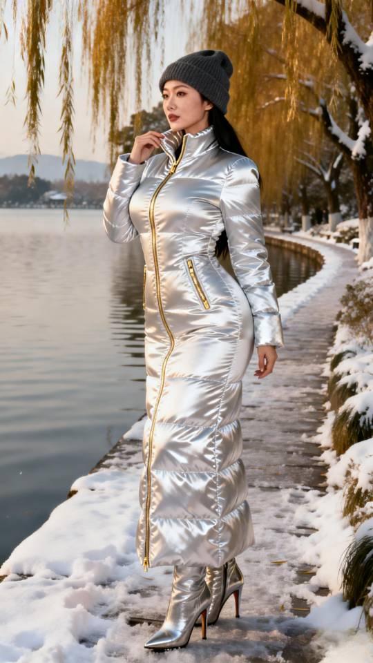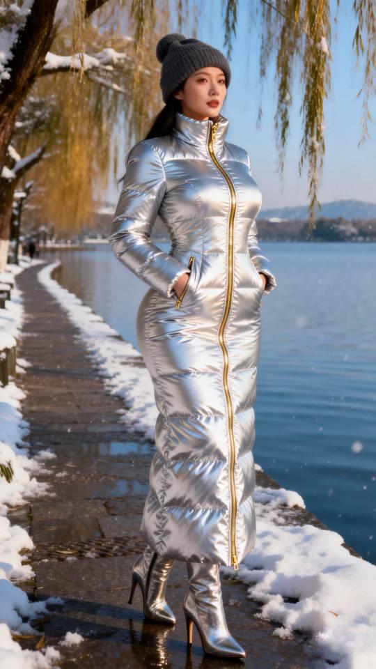 冬日湖边散步瓜白羽绒服女子。羽绒服 美女壁纸