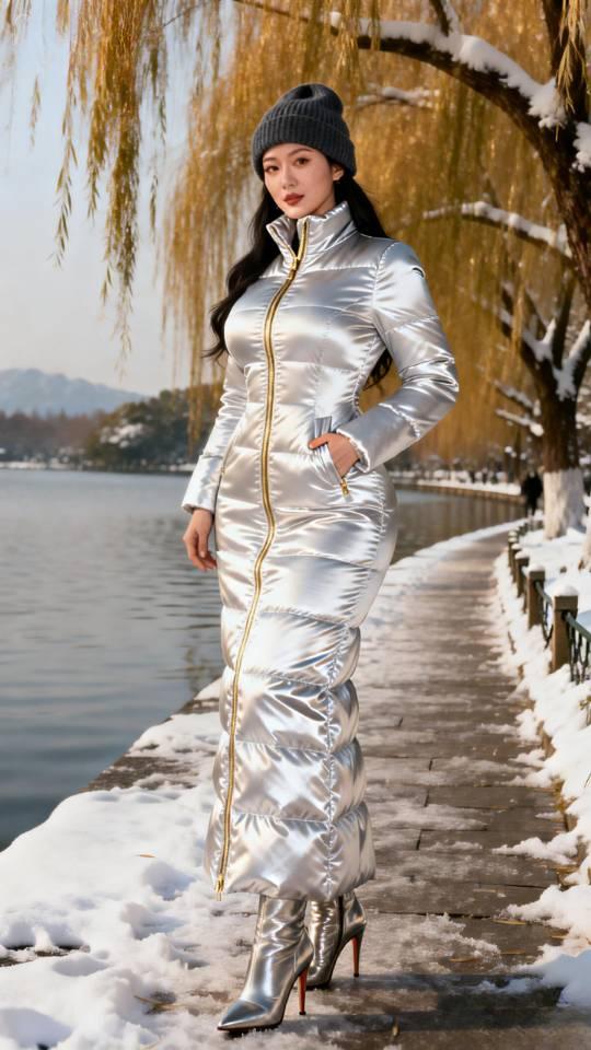 冬日湖边散步瓜白羽绒服女子。羽绒服美女壁纸