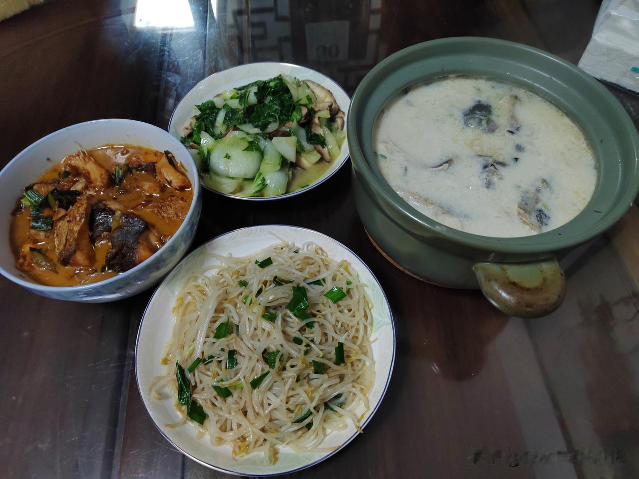 南京今日先霾后晴,最低温度5℃、最高温度13℃。午后日照充足暖意回升。 上午陪同老伴到东总医院门诊开药,顺便到附近的西安门遗址公园溜达一圈,公园内人不多,有一队人在跳广场舞。中午就在外面吃的快餐,两素一荤10元,价格还比较实在。 今天3个人的晚餐:红烧鱼块、蘑菇青菜、青炒豆芽、鱼头豆腐汤。 在菜市场买了一条花鲢3斤多,鱼头炖鱼头豆腐汤,汤里放点平菇,鱼尾做成红烧鱼块。 晚餐喝点鱼汤吃点菜肚子就饱了,烧的米饭和地瓜一点没动。
