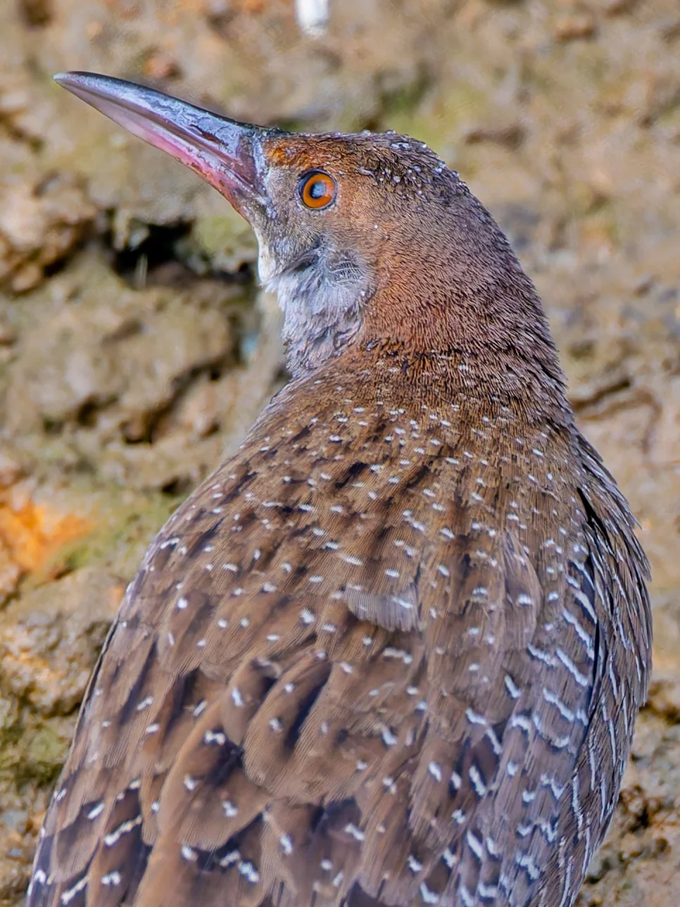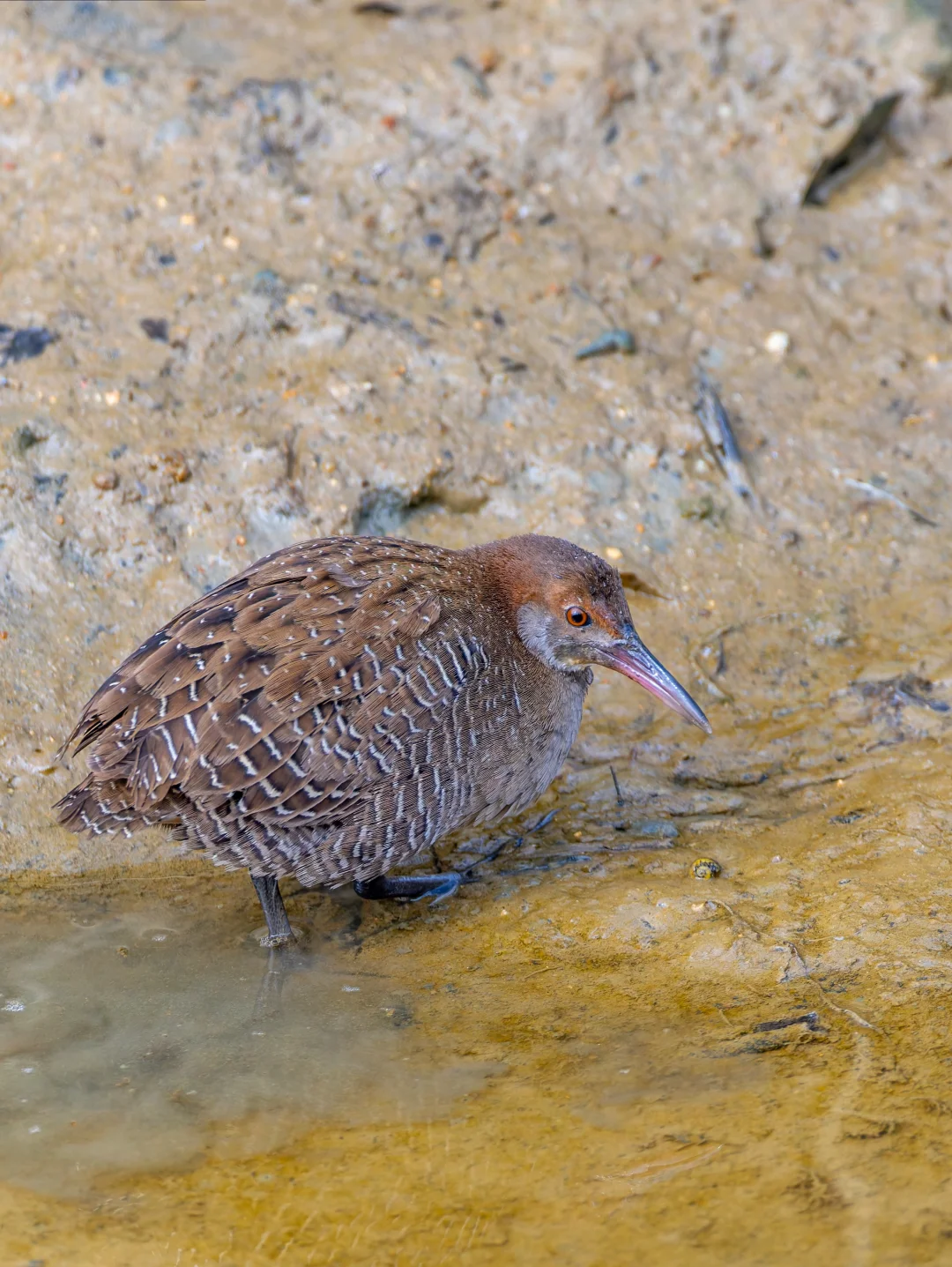 原创拍摄于2025.12 灰胸秧鸡,Slaty-breasted Rail,鹤形目秧鸡科卢氏秧鸡属。以前叫它蓝胸秧鸡,现在叫灰胸秧鸡,有着独特的蓝灰色喉部和胸部,另外背部和腹部带条纹,冠和颈背又是红褐色,粉红色的喙,很好辨认,也很漂亮。不过由于经常在泥地里摸爬滚打,嘴插入泥土里觅食,身上常常挺脏的。 去年基本上同一时间有一只出现在深圳湾,还专门前去寻找等候,没想到这次是在大鹏寻找叽喳柳莺的时候先看到了这只灰胸秧鸡,并且就走到了脚下的水沟,太给面子了,还原地引来了叽喳柳莺哈哈。