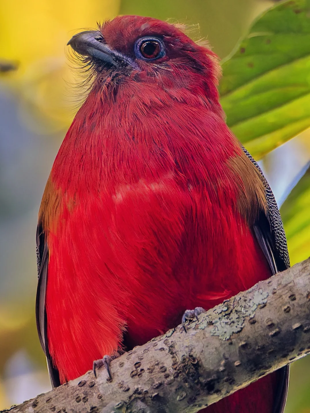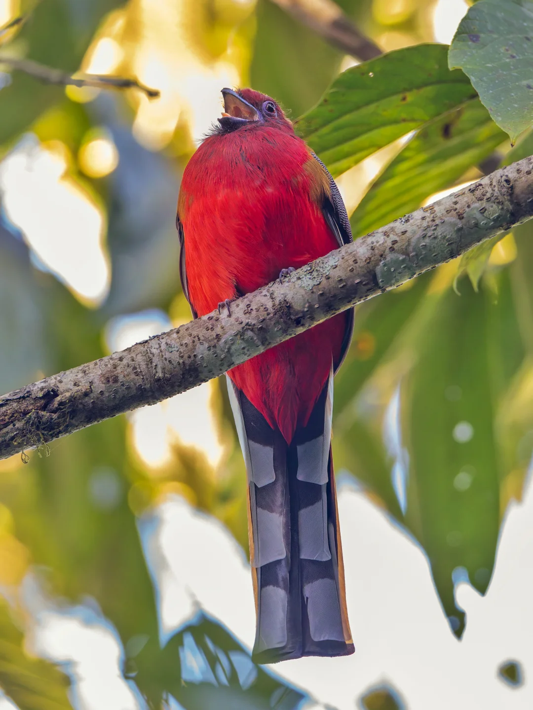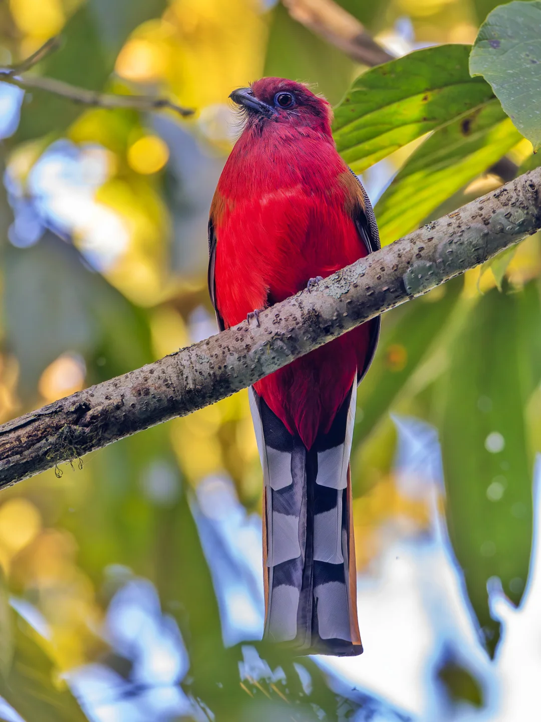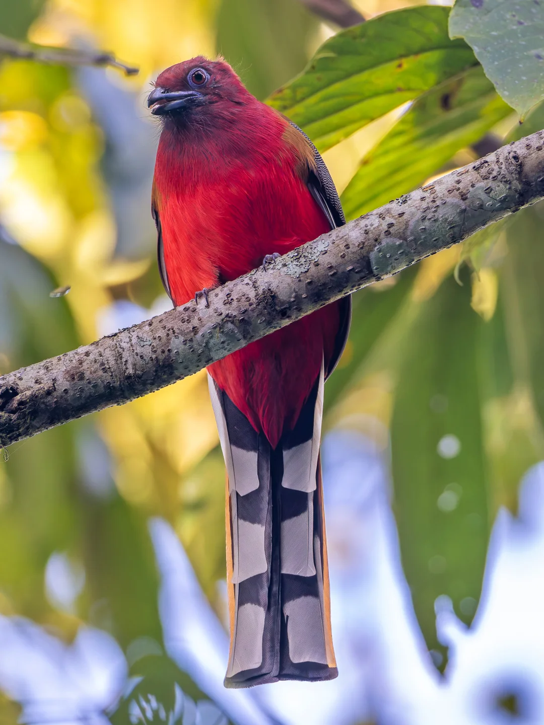原创拍摄 红头咬鹃,Red-headed Trogon,咬鹃目咬鹃科咬鹃属。国家二级保护动物,我国分布最广的咬鹃,我国南方很多地方都能看到的超美小鸟,鲜艳的红色头部腹部,尾巴的阶梯斑纹也很独特。 在墨脱格林村,我正在跟随一股鸟浪,突然一片饱和度都快溢出的红色扑在我面前的树枝上,那种震撼的感觉,并且在我面前停留了,太给面子了哈哈。