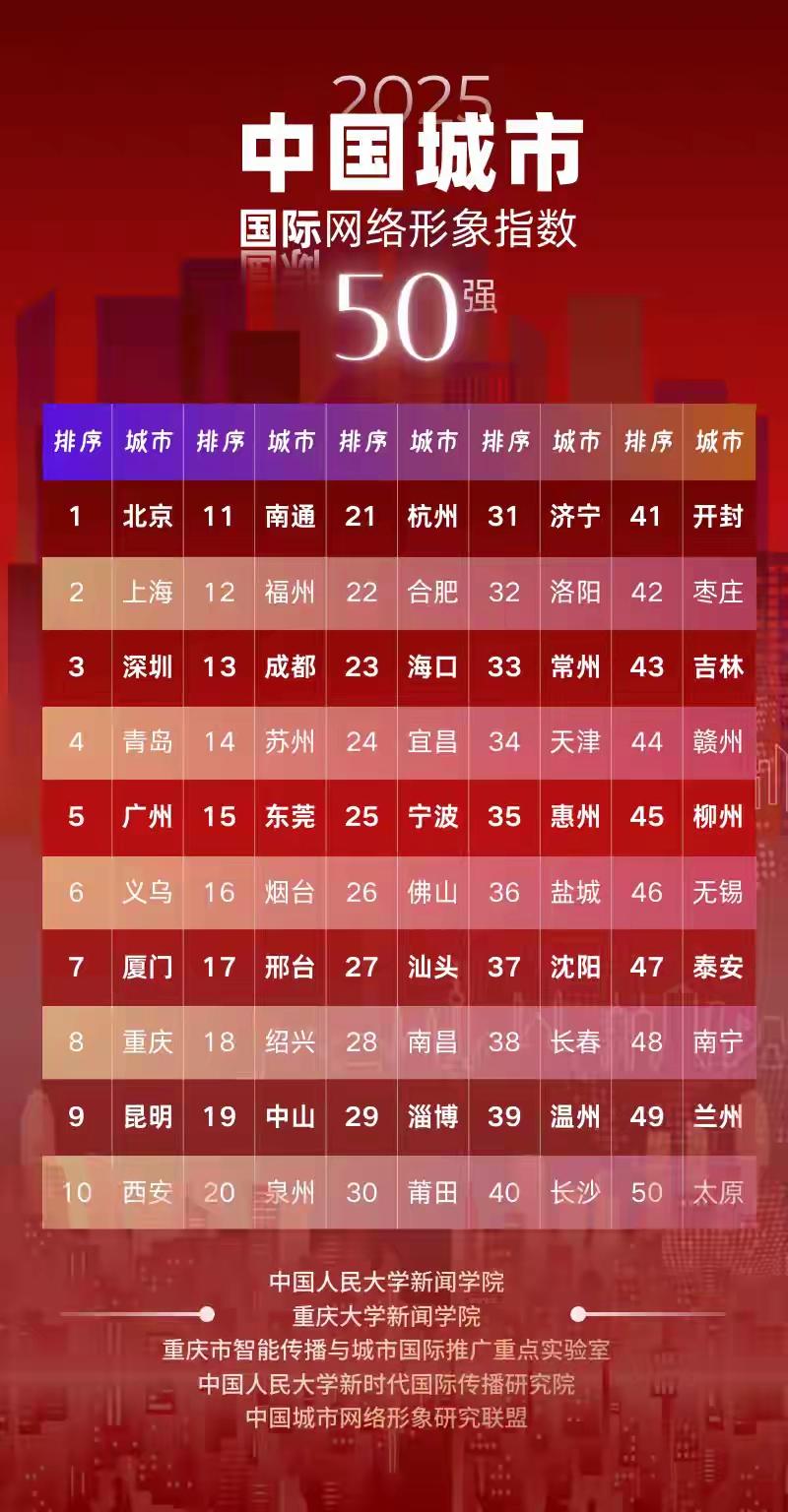 城市 国际 老徐无缘前50名,干不过济宁、开封、枣庄等市的。中国城市国际传播展现“百舸争流”新态势。《中国城市国际网络形象指数报告(2025)》在重庆发布,中国城市国际网络形象指数百强榜单揭晓。第一方阵中,江苏有南通、苏州两座城市;第二方阵包含常州、盐城、无锡;第三方阵则有扬州、昆山、连云港、徐州、淮安。值得一提的是,县级市昆山也跻身百强之列,然而南京、泰州、镇江、宿迁却未能入选,个中缘由令人费解。 江苏 南京 开封 济宁 枣庄 宿迁