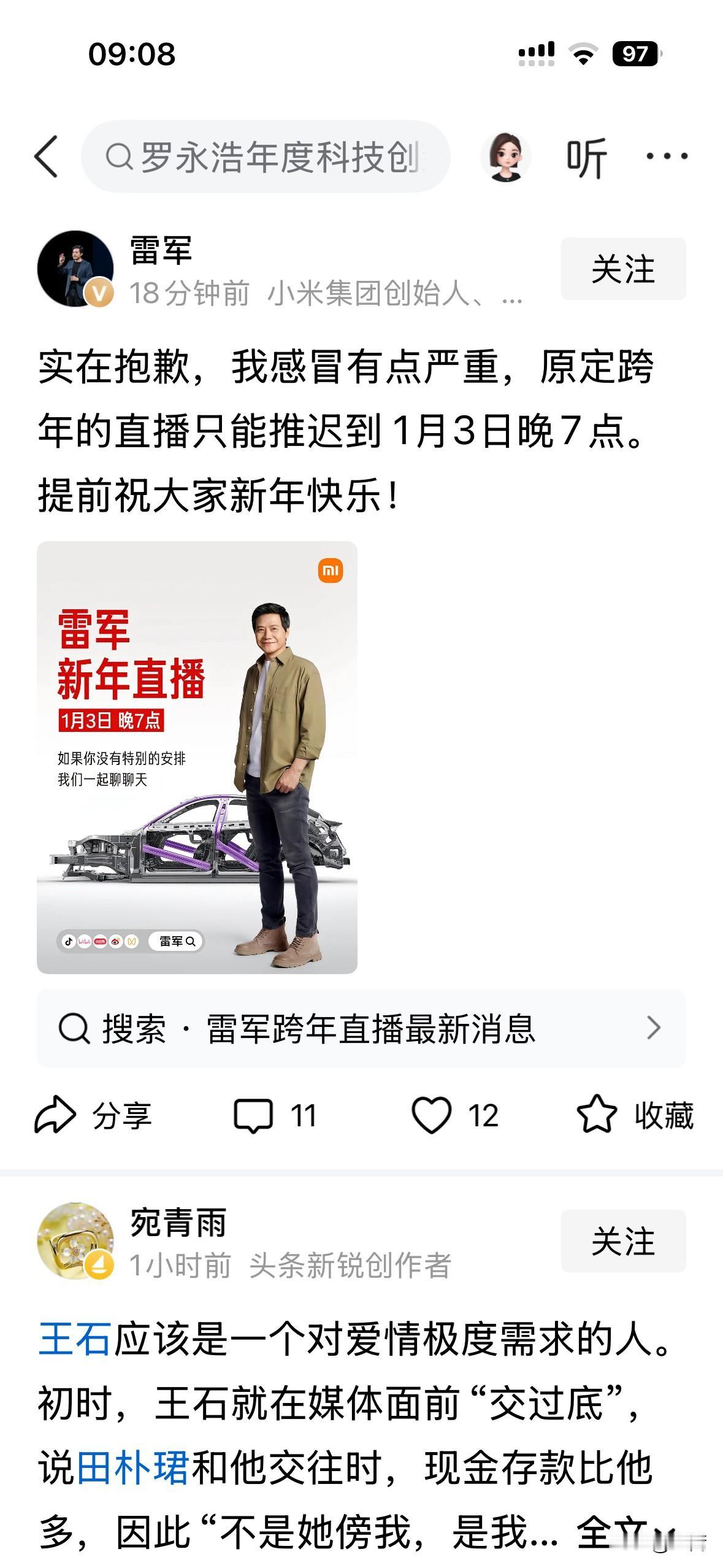 雷军今晚的跨年直播取消了,推迟几天举行。 原因是感冒,个人身体健康原因。 或