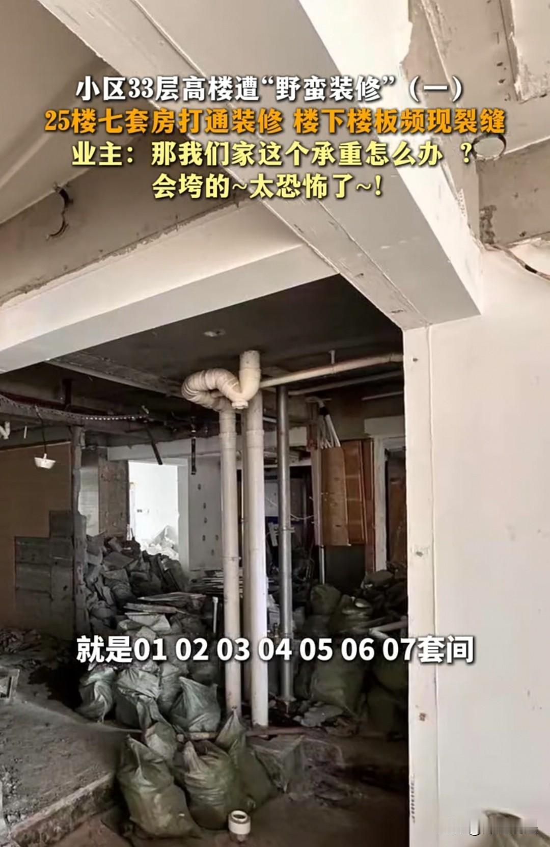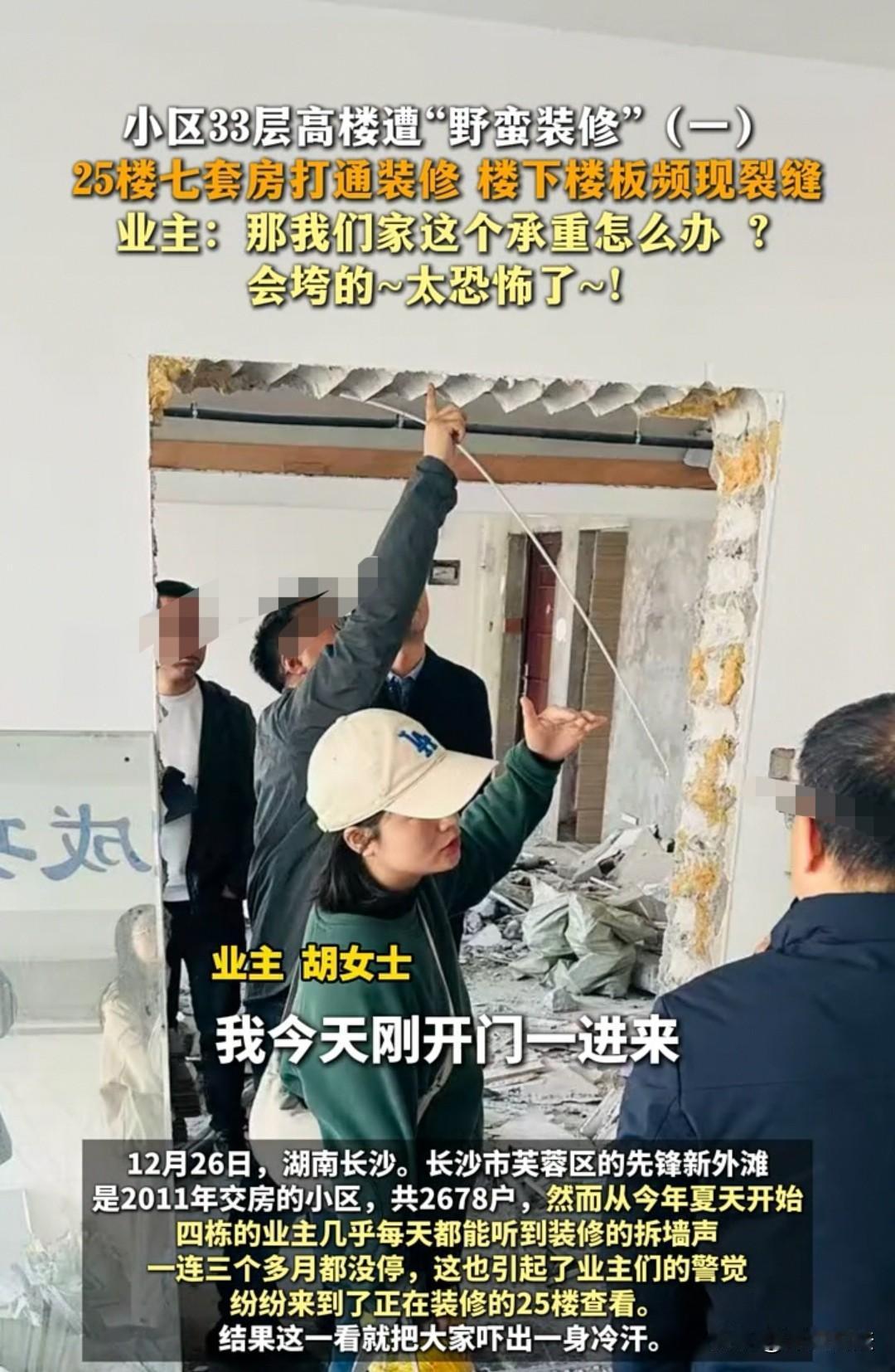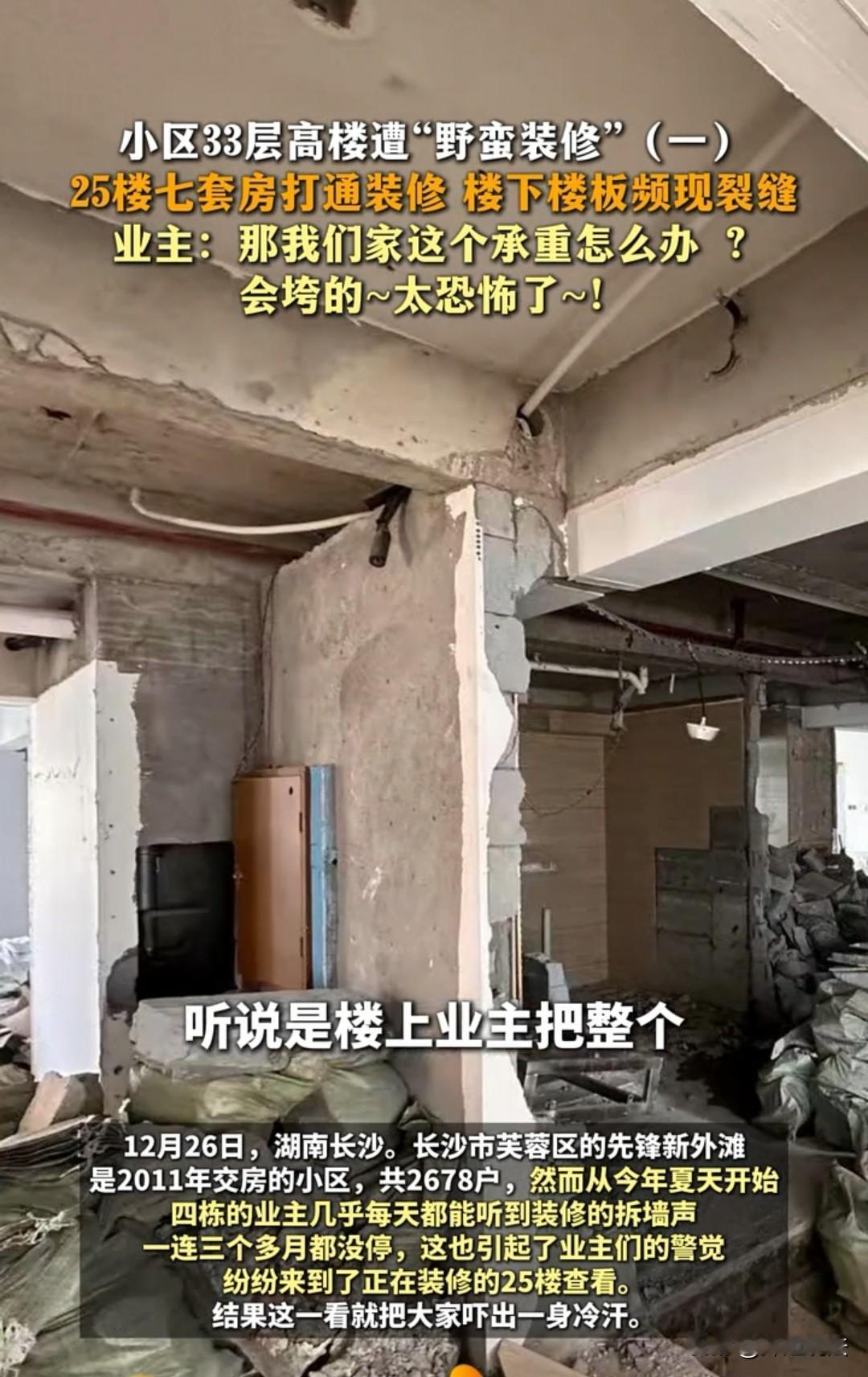 “真是吓破胆了!”长沙,女子住33层高楼的24楼,楼上25楼竟然把7套房全打通,还敢砸承重墙,导致24楼墙面裂满缝隙,女子看着裂缝吓坏了:“上面8层的承重全压我家了,这楼要是垮了怎么办?房子本来想租出去,现在谁敢租?生怕租户出安全问题,这不是把人往火坑里推吗!” 12月26日,长沙芙蓉区先锋新外滩小区的这起“野蛮装修”事件,让四栋的2678户业主都心惊肉跳。 这个2011年交房的小区,从今年夏天开始,四栋业主几乎每天都能听到25楼传来的拆墙声,这噪音一连响了三个多月没停,越听越不对劲的业主们赶紧跑到25楼查看,结果眼前的场景让所有人倒吸一口凉气。 25楼的7套房子被全部打通,墙体被大面积拆除,甚至连整栋楼的“生命线”承重墙都被砸得面目全非! 而住在楼下24楼的这名女子,成了最先遭殃的人。 她指着家里的墙面崩溃说道:“你看这个楼板都震裂掉了,到处都是缝!25楼砸了承重墙,上面8层的重量全压在我家这一层的承重结构上,那我们家这个承重怎么办?这楼会垮的,太恐怖了!” 更让这位女子憋屈的是,这套房子她原本打算对外出租,可现在出了这样的事,她连租都不敢租了。 要是真把房子租出去,租户在里面住着,万一因为承重问题出了安全事故,我怎么担得起这个责任?现在不仅房子住不了,连租金都没得收,真是赔了夫人又折兵。 据业主们反映,25楼的装修行为完全是“野蛮操作”,拆墙时的震动连楼下几层都能感觉到,除了24楼,其他楼层也陆续出现了墙面开裂、瓷砖空鼓的情况。 大家多次找物业和装修方沟通,要求停止施工并彻查安全问题,但对方始终装聋作哑,没有给出任何明确的解决方案。 这让业主们怒了:“他们倒是装修得爽了,把我们整栋楼的安全当儿戏,简直欺人太甚!真是岂有此理!” 更离谱的是,物业明明早就发现25楼的违规装修行为,却没有及时制止,只是口头提醒了几句,这才让对方有恃无恐地砸墙拆房。 业主们直言:“物业就是拿了钱不办事,眼睁睁看着我们的房子变成危房。 即使业主们一再退让,没有过多追责的想法,只盼着能尽快有专业机构上门检测,不管是对受损墙体进行修复,还是对整栋楼的承重结构做加固处理,只要能拿出一份权威报告,证明这栋楼不是危房,能让大家安安心心住下去就好。 可就连这样简单的愿望,对方都不肯满足。25楼业主翻脸不认人,不仅继续施工,还扬言“我装修我的房子,关你们什么事”,绝情的态度让人心寒。 24楼的女子因为这事整天提心吊胆,晚上觉都睡不好,甚至出现了焦虑的情况,一家人的生活全被打乱了! 25楼业主的行为已经严重违法。 《住宅室内装饰装修管理办法》明确规定,禁止擅自拆改房屋主体结构和承重结构,装修人违规操作的,由房地产行政主管部门责令改正,处500元以上1000元以下罚款; 若行为危及公共安全,还可能涉嫌《刑法》中的危害公共安全罪,面临刑事处罚。 同时,25楼业主擅自拆改承重墙,导致楼下业主房屋受损、无法出租,已构成侵权,受影响的业主有权要求其赔偿房屋维修费用、租金损失等全部损失,物业因监管不力,也需承担连带赔偿责任。 好好的一栋33层高楼,就因为25楼业主的一己私欲,变成了让几百户居民提心吊胆的危房。 25楼业主拿着自己的房子当赌注,却把整栋楼的生命安全踩在脚下,真是刷新三观! 对于这起25楼打通7套房砸承重墙、导致楼下开裂的事,你觉得该怎么追责才解气? 素材来源于风芒新闻2025年12月26日报道。