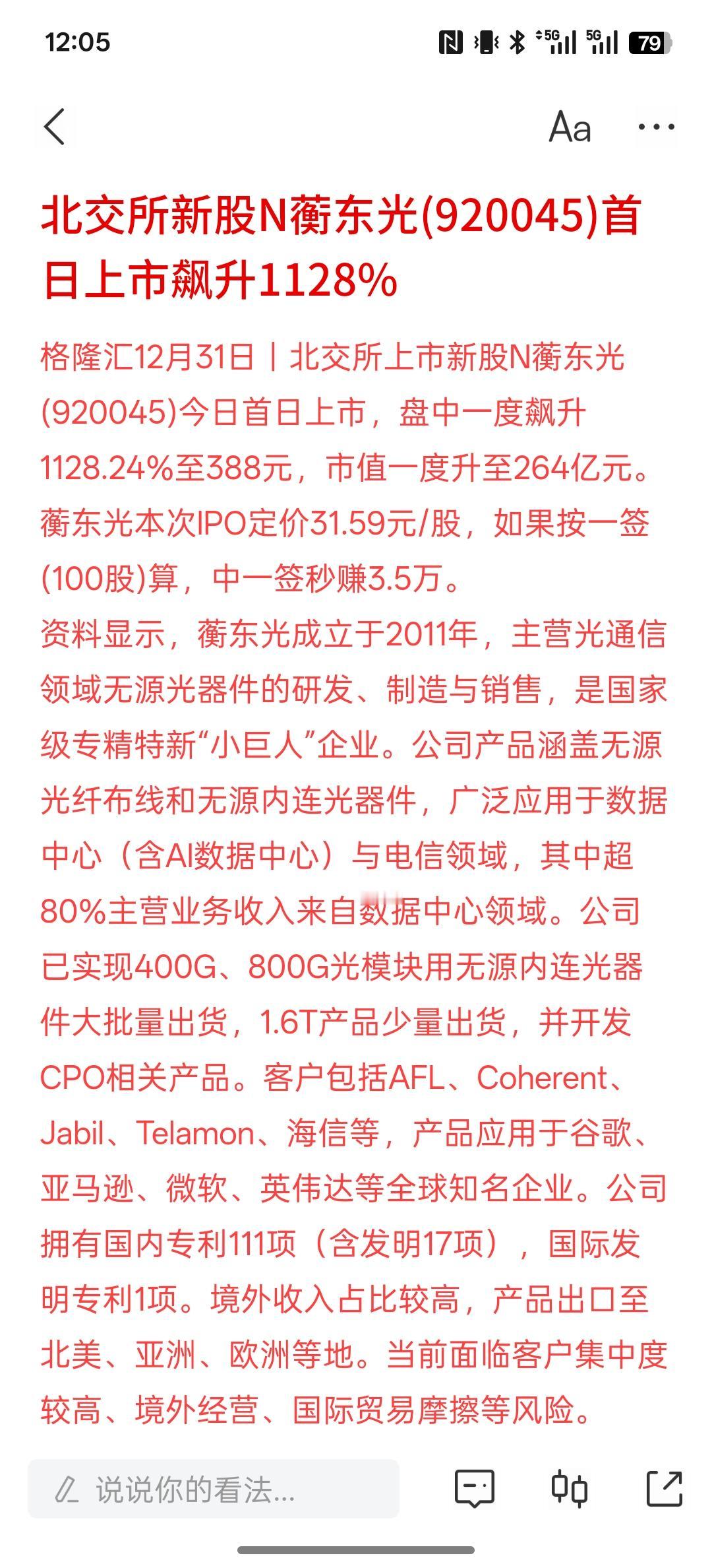 上市就暴富了,北交所新股N蘅东光(920045)首日上市飙升1128%,这要是中
