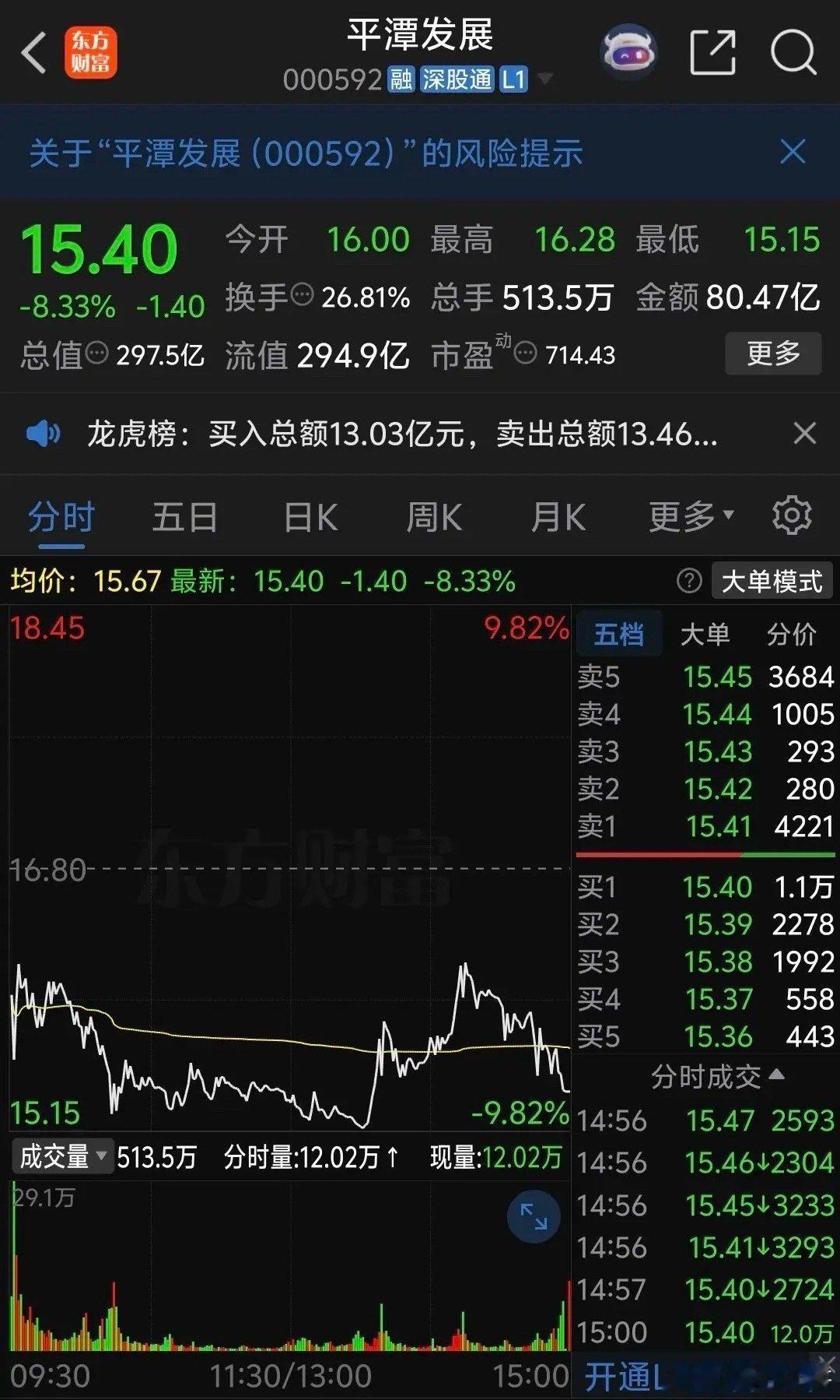 平潭发展惨烈暴跌8.33%,该来的还是来了,早盘直接低开4.76%,开盘后迅速跳水抄底资金很快涌入拉升,但是今天并没有拉起来,16关口才刚刚冲上一点就回落,然后震荡一段时间后第二波冲上16又是冲高回落,这下股民彻底慌了,割肉盘不断涌现股价快速跳水暴跌,到午后差一点砸跌停,暴跌了9.82%,不过热门股人气就是高,这时候仍然有很多资金进入抄底,展开两波非常强的反弹,但同样是冲上16后又回落,尾盘不少资金割肉离场造成持续下跌,不管节后是什么行情,平潭发展短期真的炒太高了市盈率已经714倍。