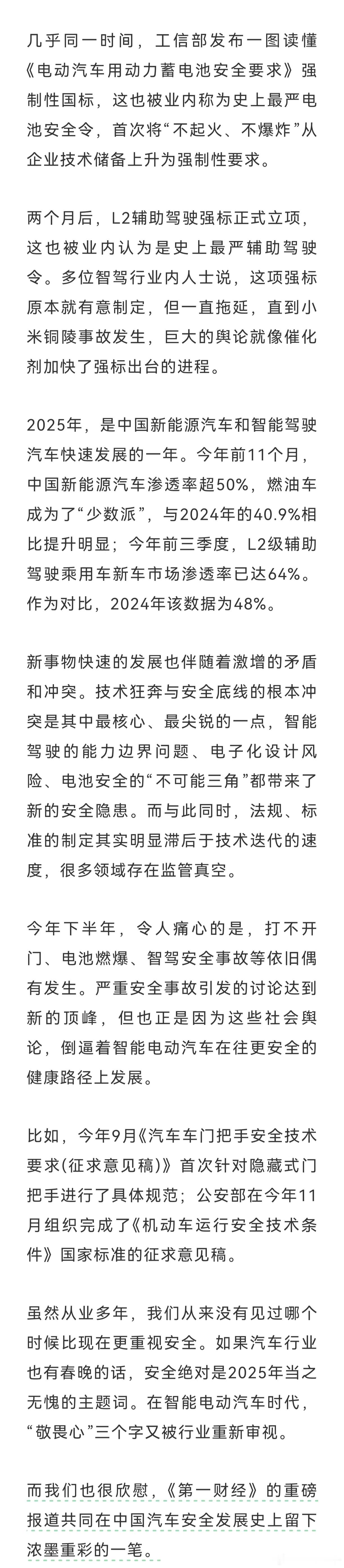 2025年的最后一天,第一财经再次“剑指”小米!今天凌晨,第一财经题为《2025,我们共同见证了中国汽车安全强监管时代的来临》的文章发布。第一财经对小米是念念不忘啊