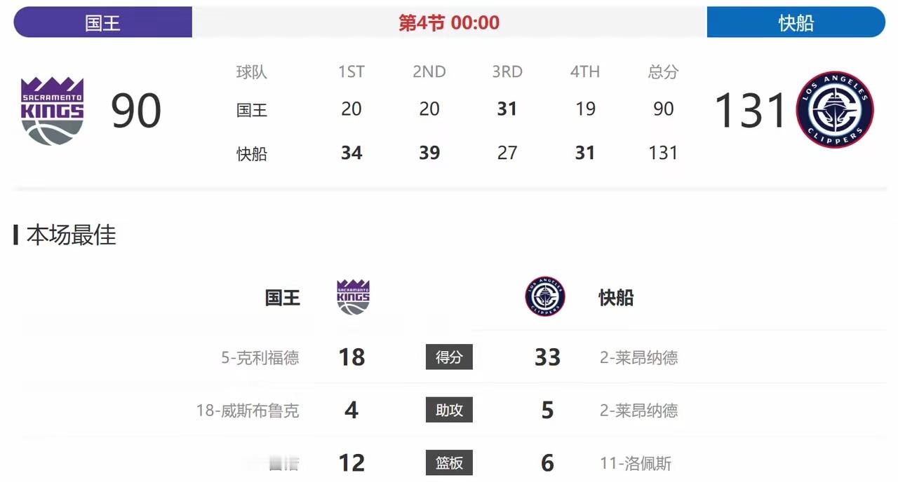 狂胜41分!快船轰5连胜,小卡33+5再超神!!!北京时间12月31日,NBA常规赛,快船坐镇主场迎击国王,本场比赛之前,快船10胜21负排名西部第13,虽然战绩很难看,但近期快船强势反击,已经迎来一波4连胜,并且在此期间先后击败了西部排名前列的湖人,火箭,击败了东部排名第一的活塞。很显然,这才是快船的真正实力,前提是小卡和哈登二人保持健康,两人本赛季都有点梦回巅峰的感觉了。另一边的国王队,本场比赛之前,8胜24负排名西部倒数第二,国王虽然也有很多全明星球员,但首先是伤病太多,小萨,拉文,已连续缺席多场比赛,其次阵容结构不兼容,后卫太多,持球人太多,本赛季国王基本是要摆烂了。