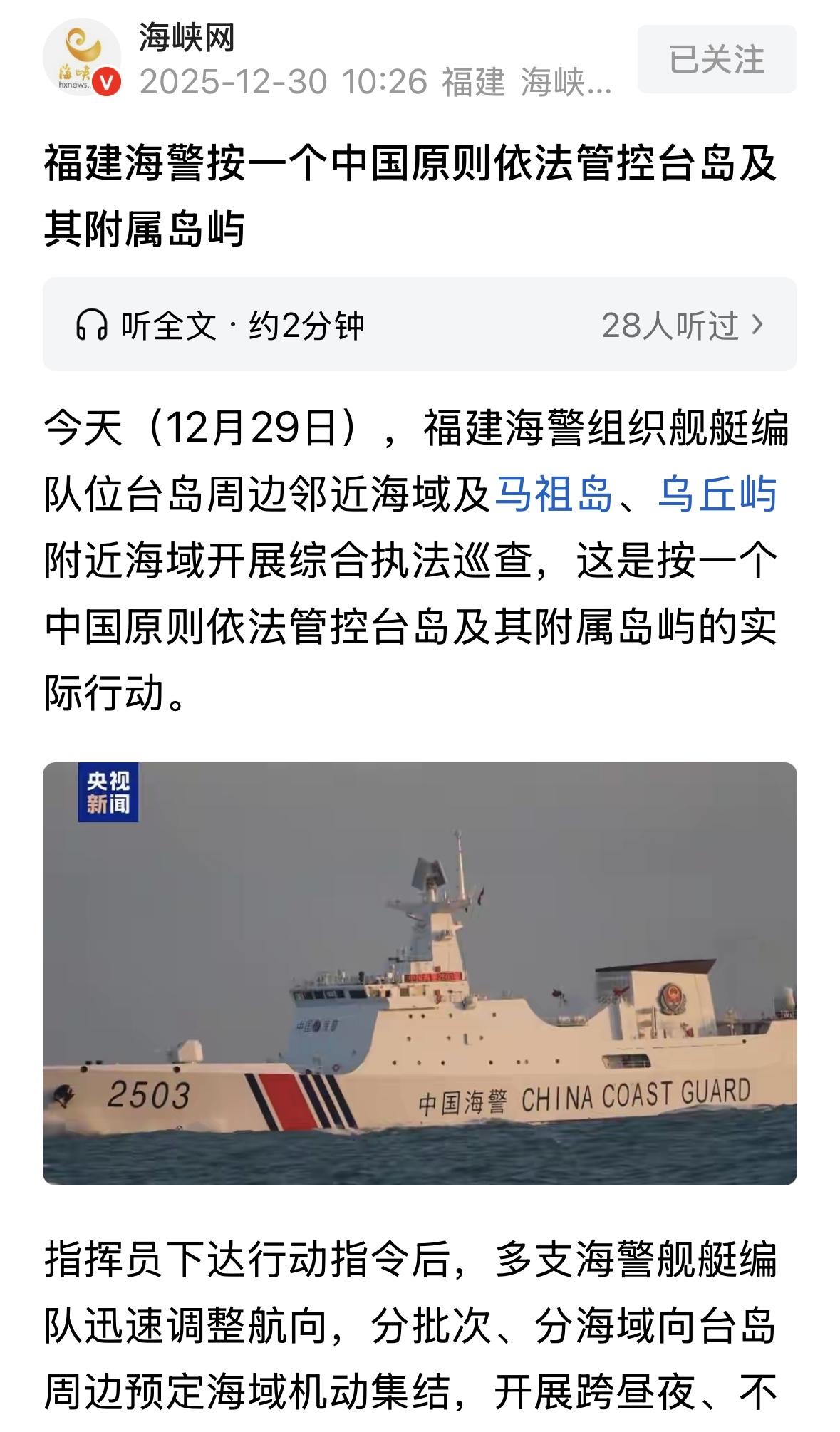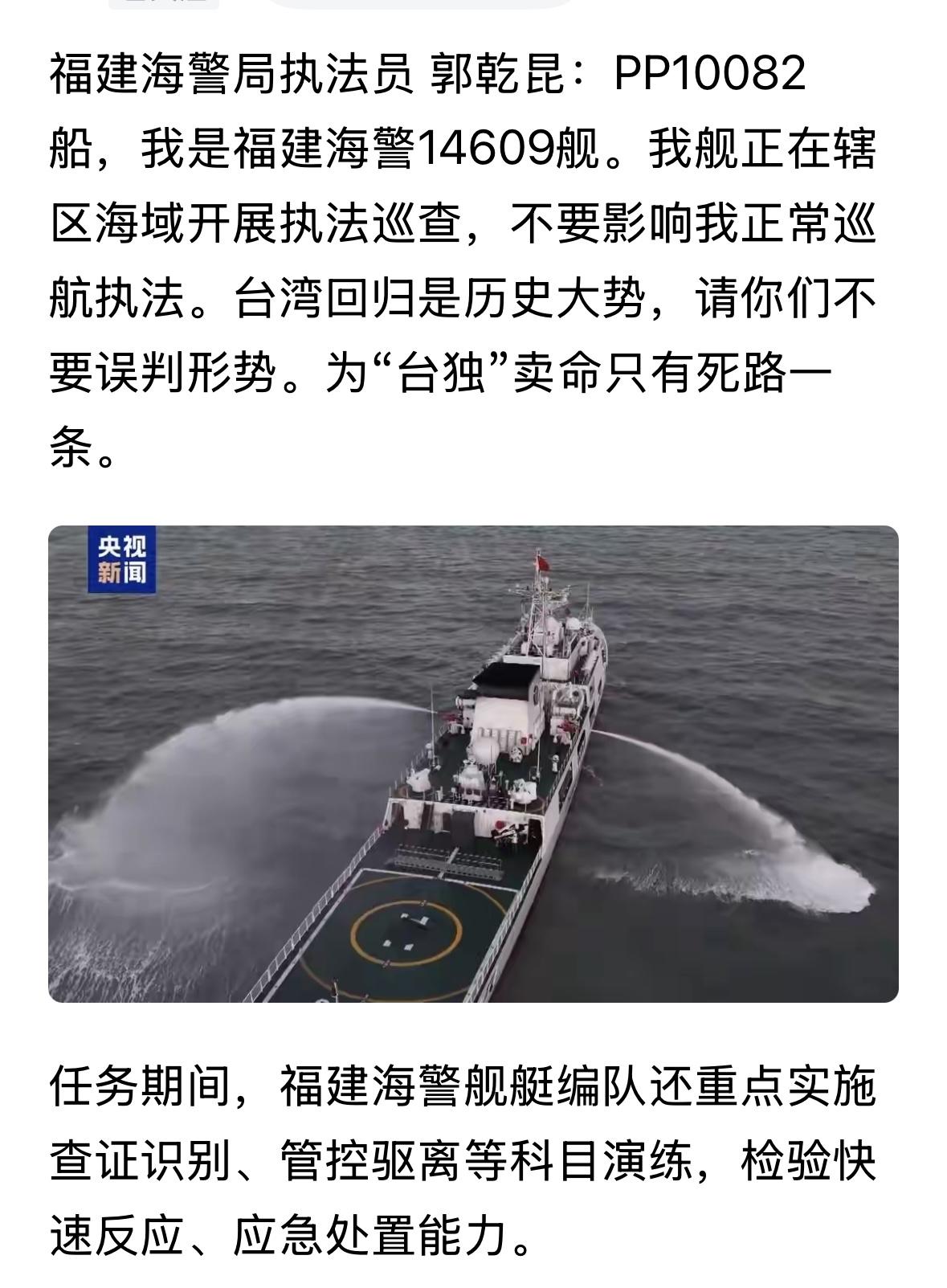 2025年最后一个好消息,台湾海警工作,由福建省海警接手,这是祖国统一迈出实质性一大步!未来还会有更多工作,转移到福建这边来!福建省的担子很重啊!