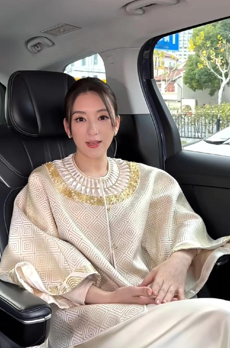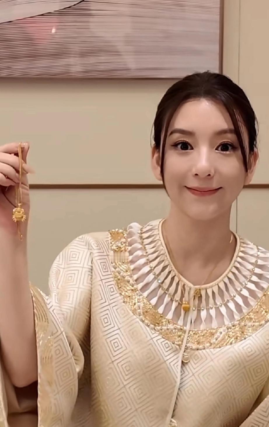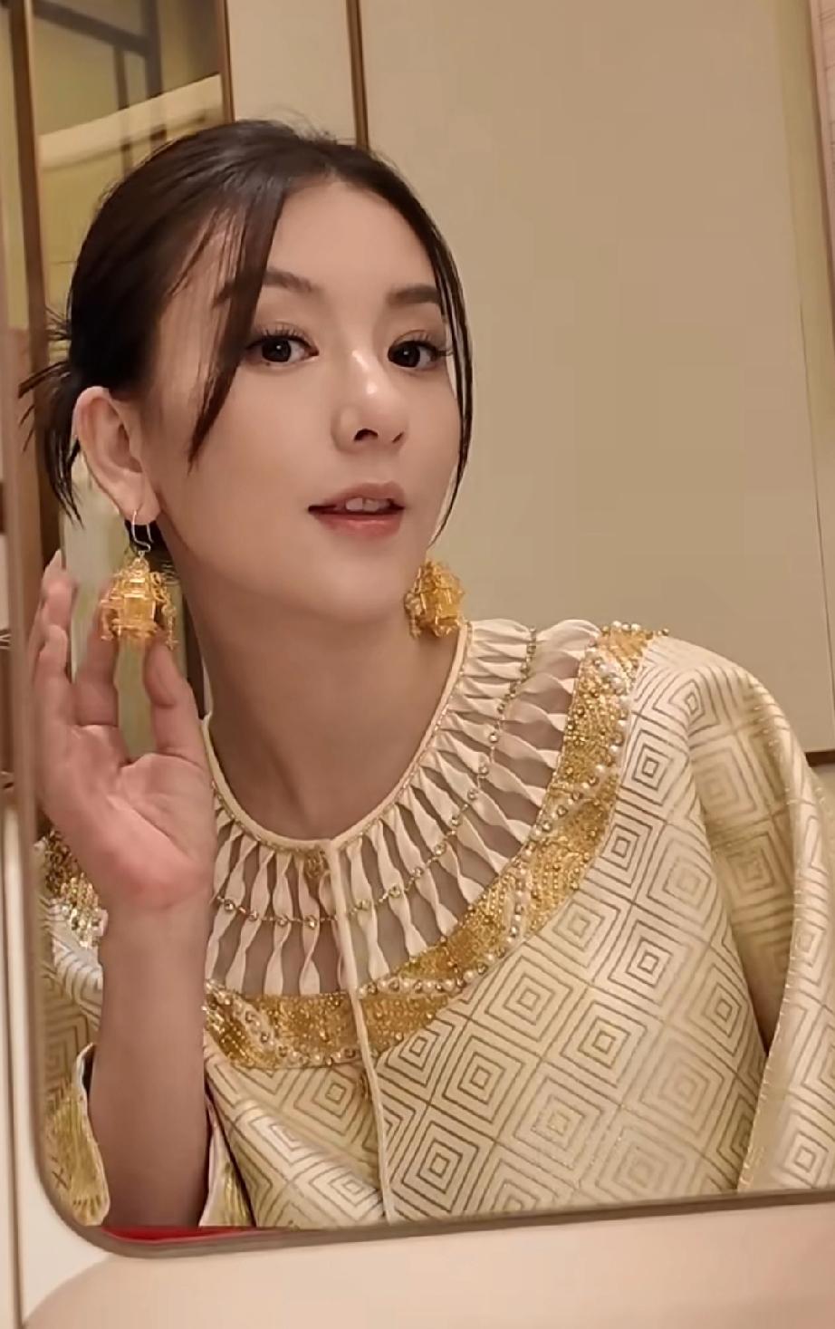 方媛生完三胎是越来越贵气了,最近一条视频中,方媛穿着一身金色新中式套装,手提爱马