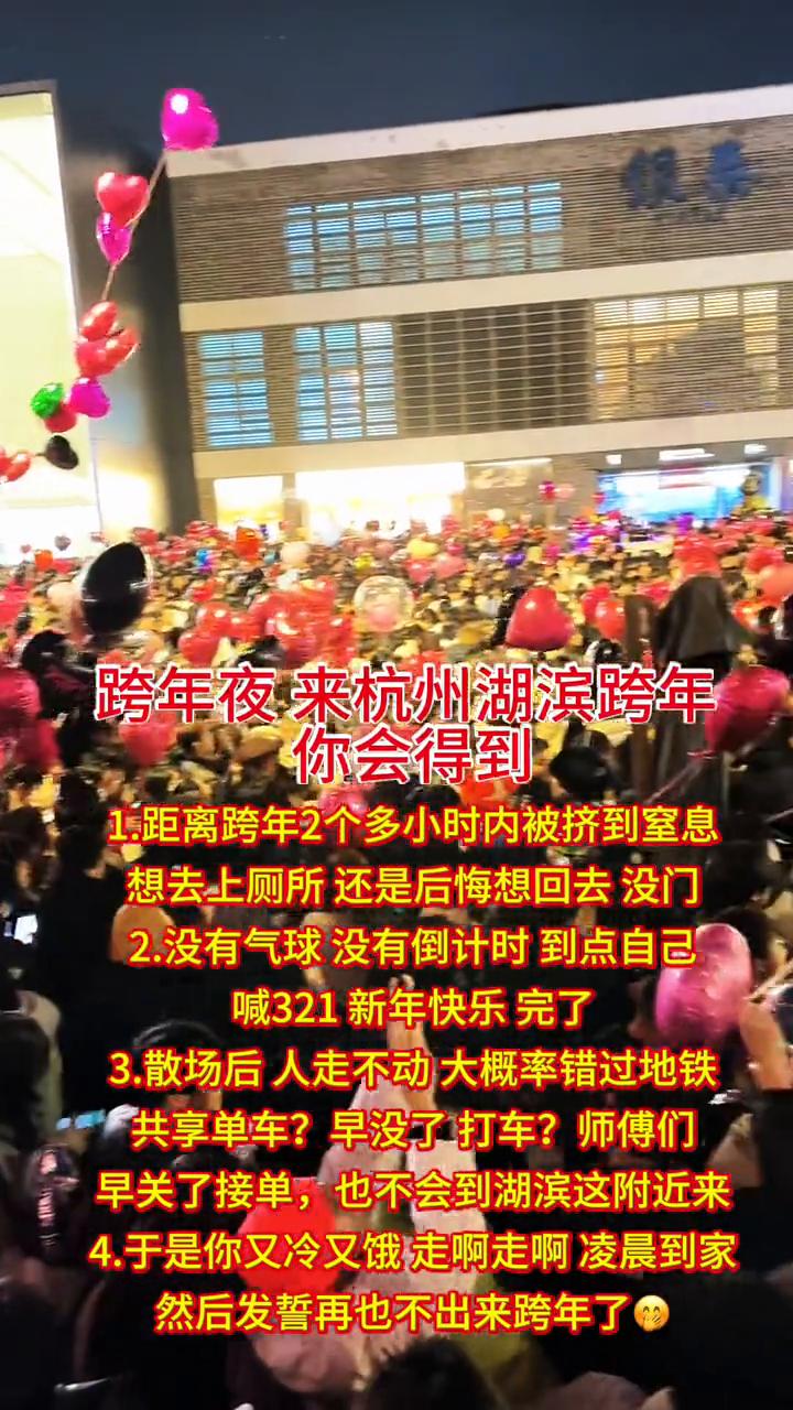 跨年夜来杭州湖滨跨年你会得到什么? ·1.距离跨年2个多小时内被挤到窒息,想去上厕所还是后悔想回去没门。 ·2.没有气球,没有倒计时,到点自己喊321新年快乐完了。 ·3.散场后人走不动,大概率错过地铁。共享单车?早没了打车?师傅们早关了接单,也不会到湖滨这附近来。 ·4.于是你又冷又饿,走啊走啊凌晨到家,然后发誓再也不出来跨年了。