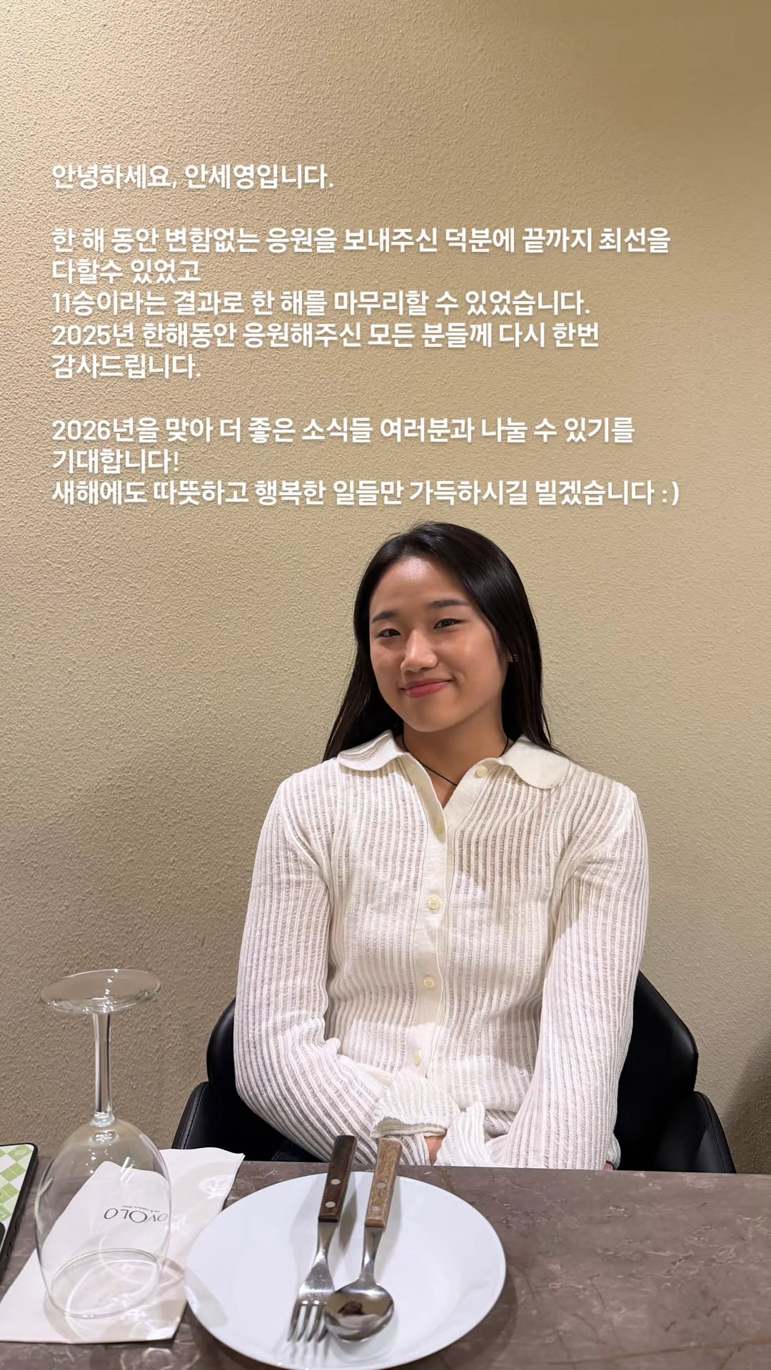 安洗莹发文:大家好,我是安洗莹谢谢你们这一年中不懈的支持,让我可以付出我的一切,直到以11站胜利结束这一年我会感谢2025年支持我的每一个人!我期待在2026年与大家分享甚至更多好消息!祝大家有一个充满温暖和快乐的新年:)