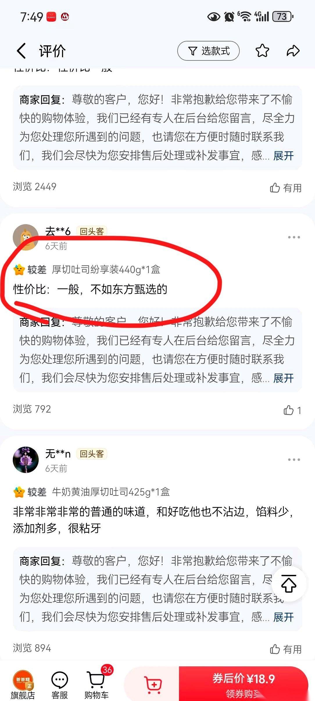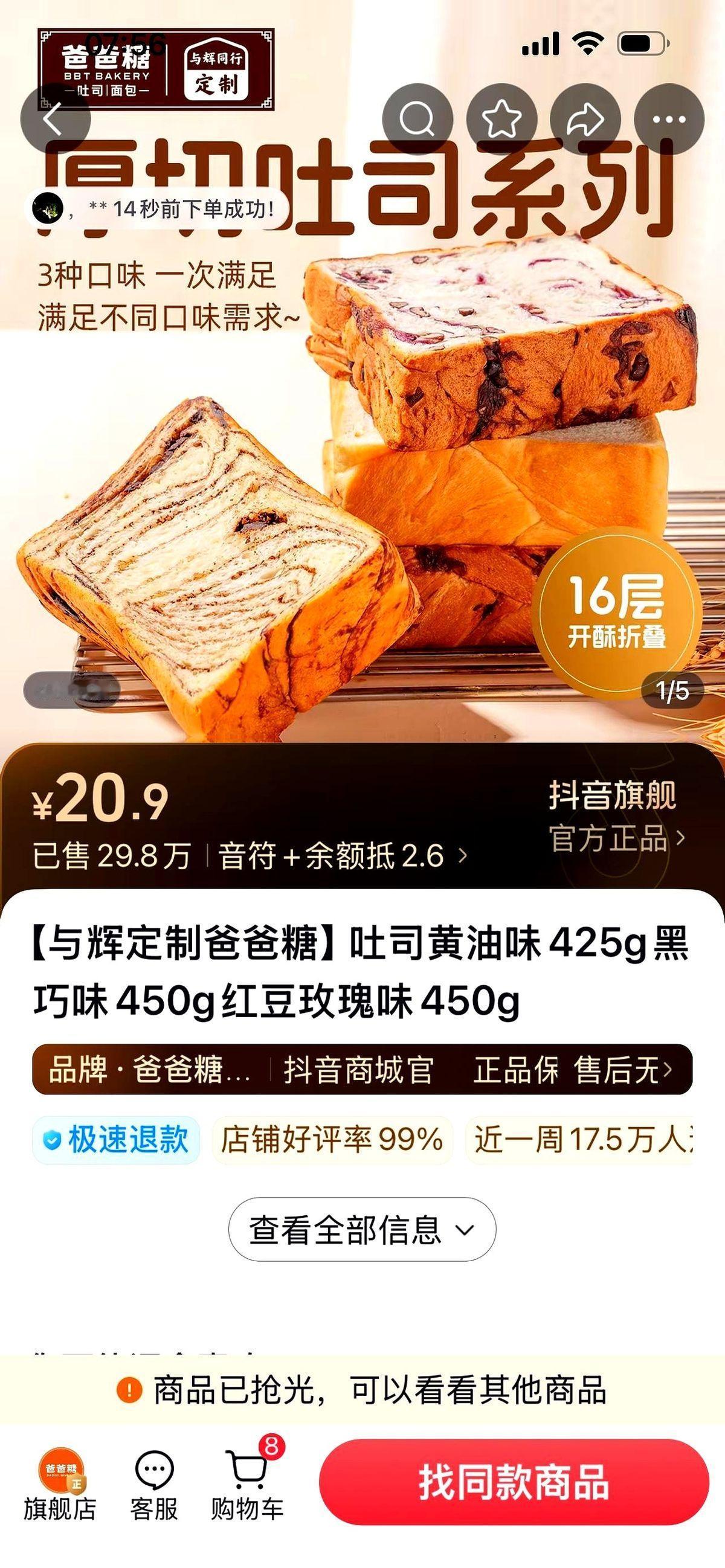 “又没抢到!”,屏幕前的网友一声哀嚎,手里的手机都快捏扁了。 这已经是几天内的第N次,他眼睁睁看着“与辉同行”的定制吐司面包,又一次在“十万单”库存面前,被二十多万双筷子一秒秒光!留言区里,一片“求放过”、“给没抢到的留点活路”的声浪。有人甚至喊话上次满载而归的幸运儿:“兄弟,手下留情,给我们尝尝鲜啊!” 但抢购大军哪听这个?明天,他们还会准时蹲守,继续拼手速。 这火爆程度,直接把那些“花里胡哨”的故事,按在地上摩擦。消费者用真金白银投票,不是因为你故事讲得好,而是因为产品够硬! 当然,几十万单卖出去,总有不爱吃的,差评也随之而来。这本是正常事。可有几条差评,味道就不对了。 “定制吐司口感不好。”——没问题,这是真实反馈,欢迎! “你把‘与辉同行’的定制吐司,和贴牌吐司放一起比?”——等等,这波操作直接让人血压飙升。这是来砸场子的?还是顺便给你家产品打广告?你广告费交了吗? 简直就是把直播间当自己家后花园了! 说回“与辉同行”,即便吐司卖爆,昨晚的直播数据却有点“不给力”,没过亿。董宇辉才跑了9700万步,新朋友只来了五万。小兰兰跑了1600万步,新朋友两万。只有巴豆家族四大酱缸,接力跑了1700多万步,又把小兰兰甩在身后,有点优秀! 这种一边抢破头,一边被奇葩差评狙击的现象,你怎么看?是流量大了,啥牛鬼蛇神都来了,还是真金白银,也堵不住悠悠众口?