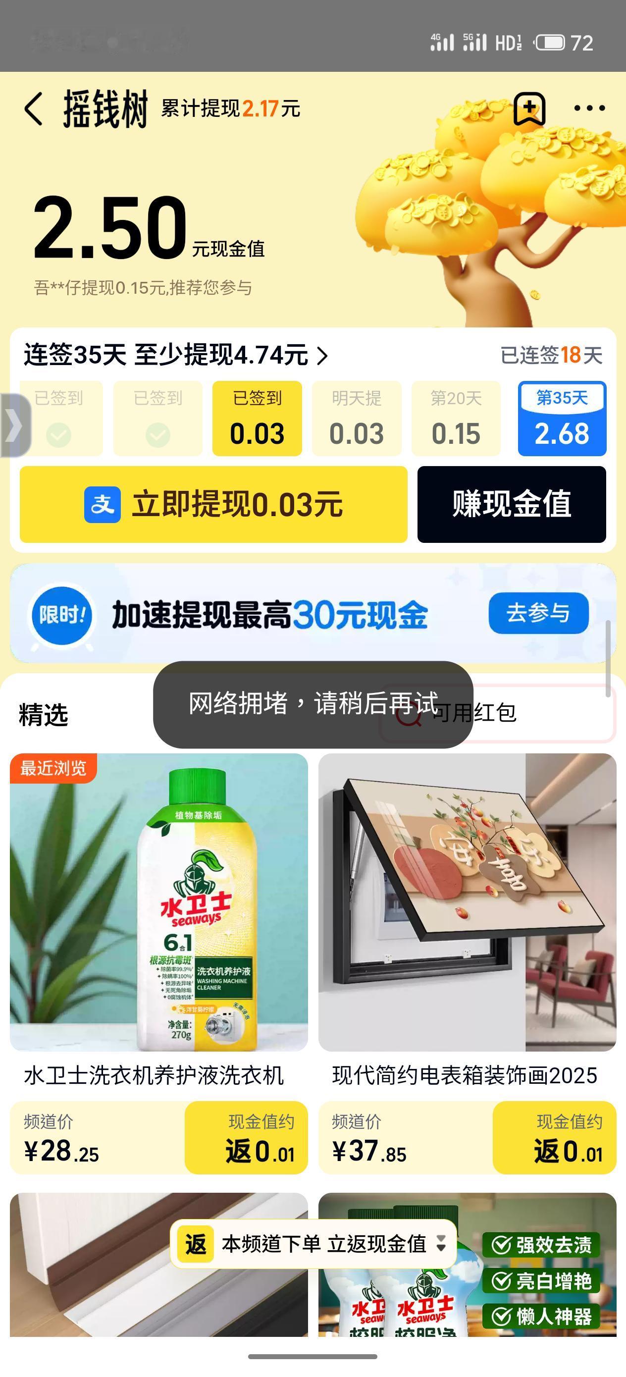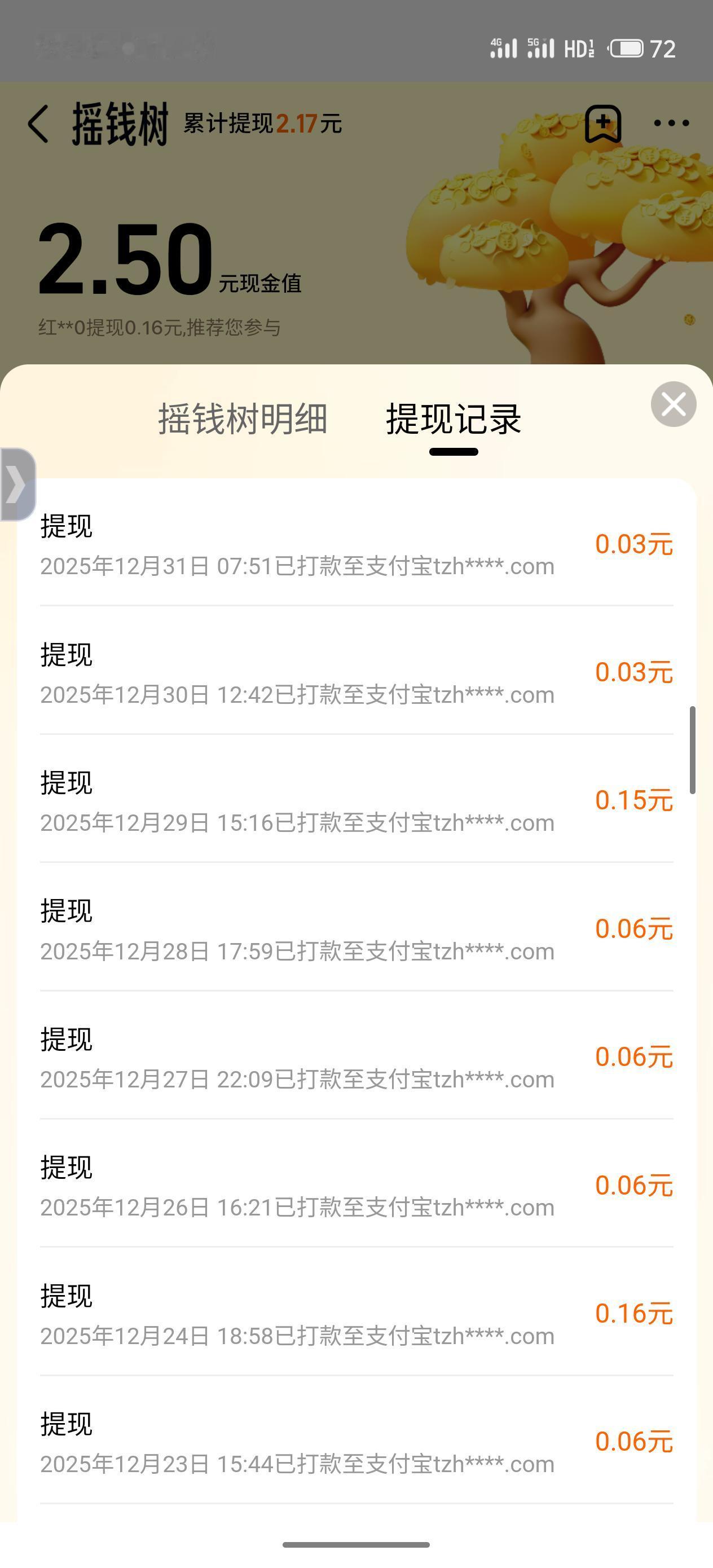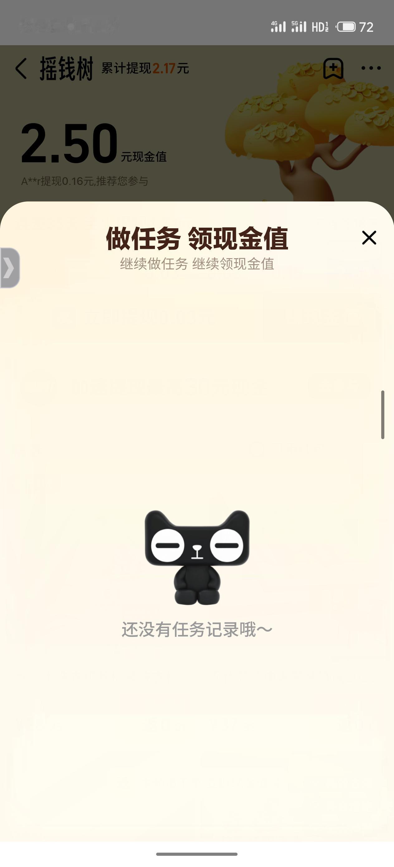 天猫APP 摇钱树 每天可以提现几分钱 有时候也有几毛钱 我有些任务可以做 不过我这边经常报错 换个时间就可以了