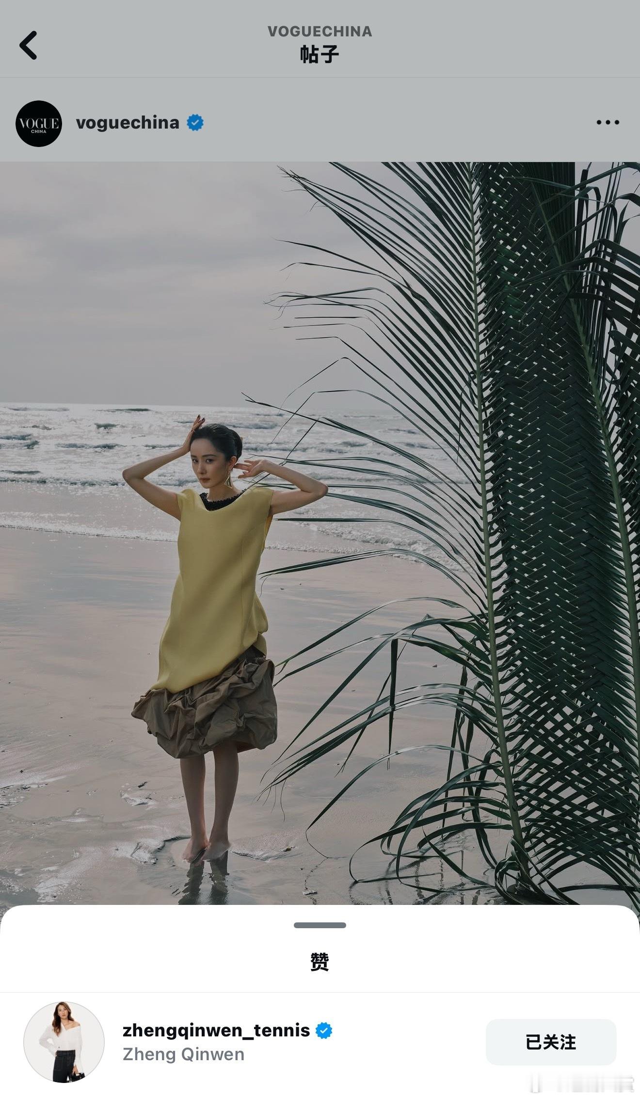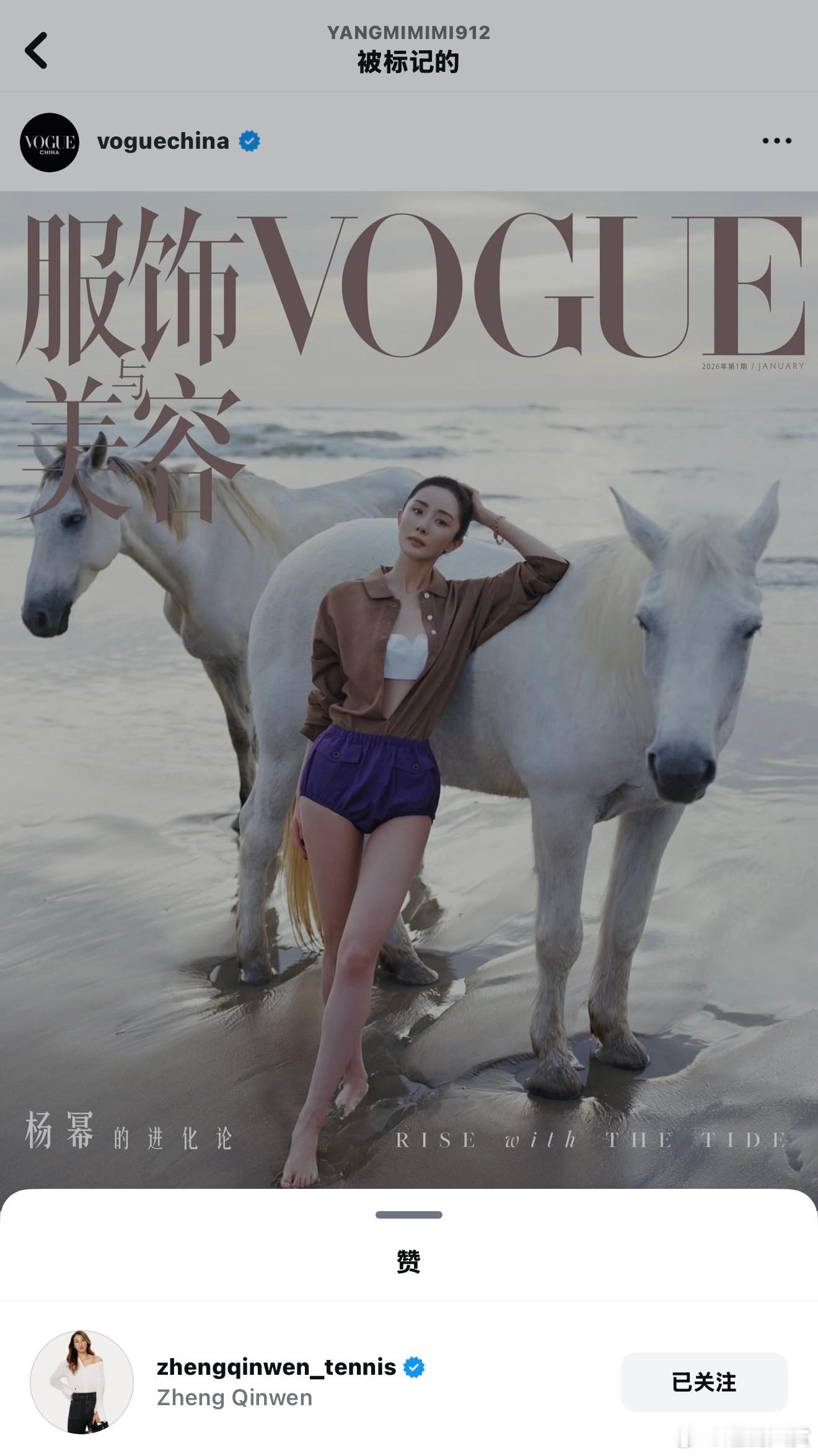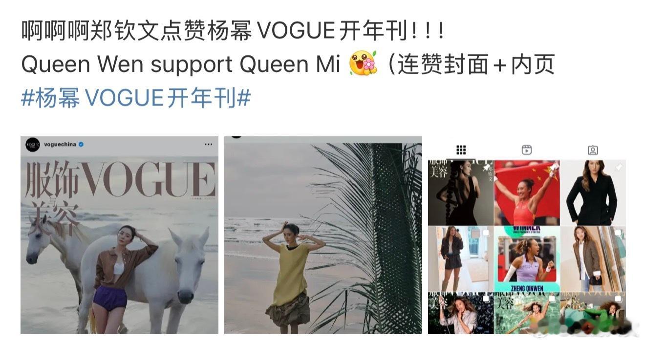 刘冲介绍杨幂和郑钦文认识郑钦文点赞杨幂vogue开年刊后续来了,刘冲已经介绍杨幂
