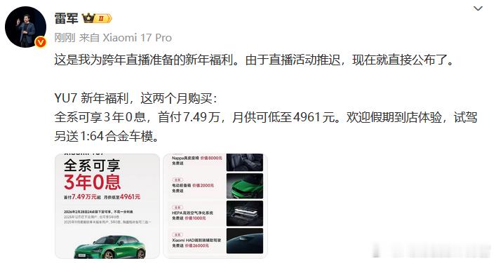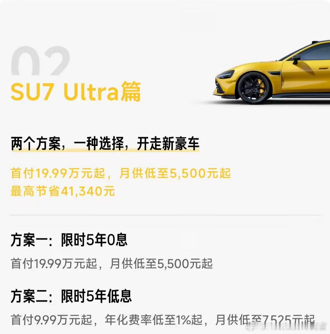 新年第一天,雷军居然官宣了小米汽车的免息政策其中YU7全系可享3年0息,首付7.49万,月供4961元同时,SU7 Ultra也限时开启了5年0息或限时5年低息两种方案,5年0息首付19.99万元起,月供5500元起小米YU7全系推出3年0息购车活动