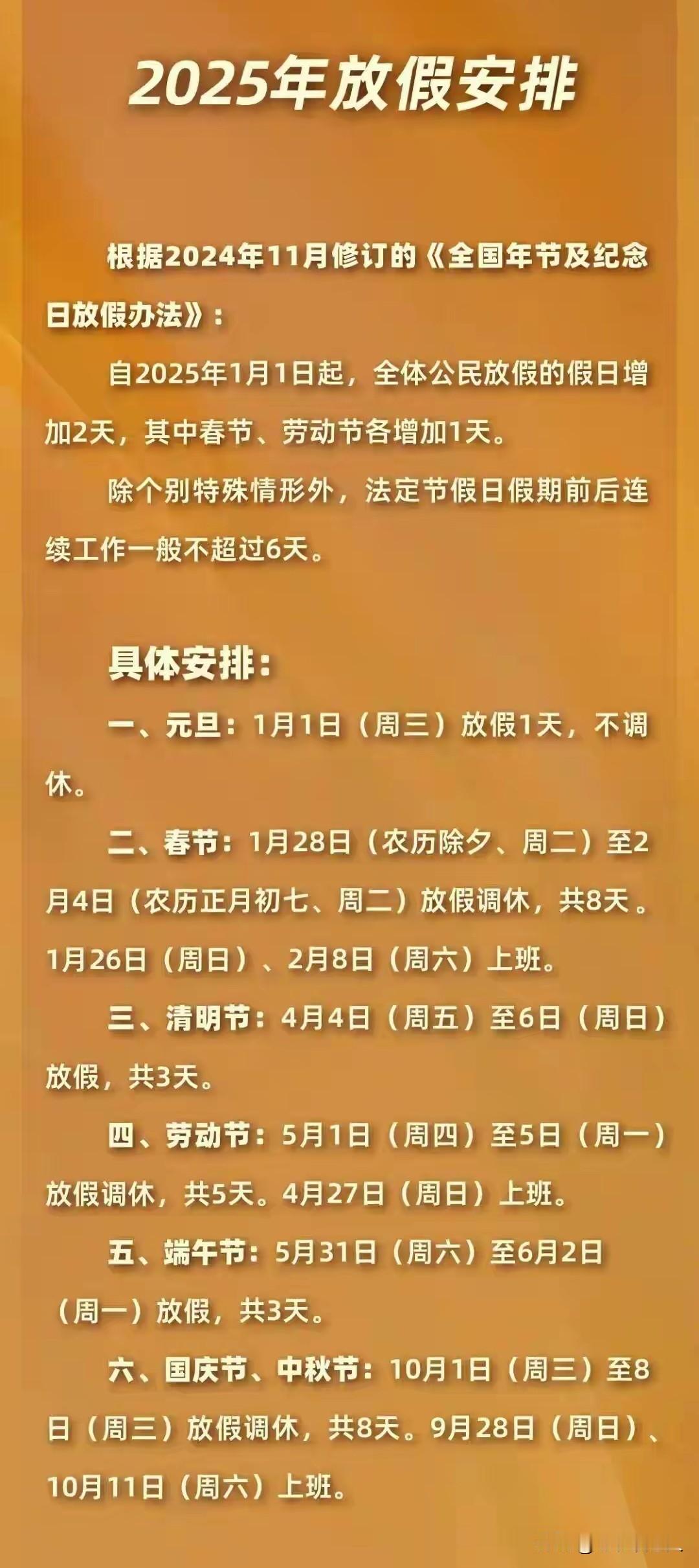 好消息!2026年比去年多了5天假期! 今天是2026年第1天,元旦,是一年的开始。 今年是一个好年份。今天各种大大小小的好事情连连扎堆的来,让每一个人,高兴万分,让老百姓乐开了怀! 刚才看到媒体报道,2026年比去年多了5天假期,换一句话说,就是一个星期不上班,不放假,上班的人该有多爽啊,该有多高兴呢?并且这5天都是国家法定假日,坐在家里休息,工资照拿,你说这事情好不好? 下面就来盘点一下,2025年和2026年,法定假期对照一下,就明白了,这五天的法定假日,究竟是哪个时候多了5天? ①,2025年元旦,1月1日,星期三,不调小,放假一天。 2026年元旦,1月1日至3日,放假三天,1月4日上班。 ②,2025年春节,1月28日至2月4日共放假8天。 2026年春节,2月15日至23日放假调休共9天,2月24日,2月28日照常上班。 ③2025年清明节,4月4日至6日,放假三天。 2026年清明节,4月4日至6日放假三天。 ④2025年劳动节,5月1日至5日放假5天,4月27日上班。 2026年劳动节,5月1日至5日放假5天,5月9日上班。 ⑤2025年端午节,5月31日至6月2日放假3天。 2026年端午节6月19日至21日放假三天。 ⑥2025年国庆节、中秋节,10月1日至8日。放假8天,9月28日,10月11日上班。 2026年中秋节,9月25日至27日,放假三天;国庆节。10月1日至10月7日放假调休7天,9月20日,10月10日上班。