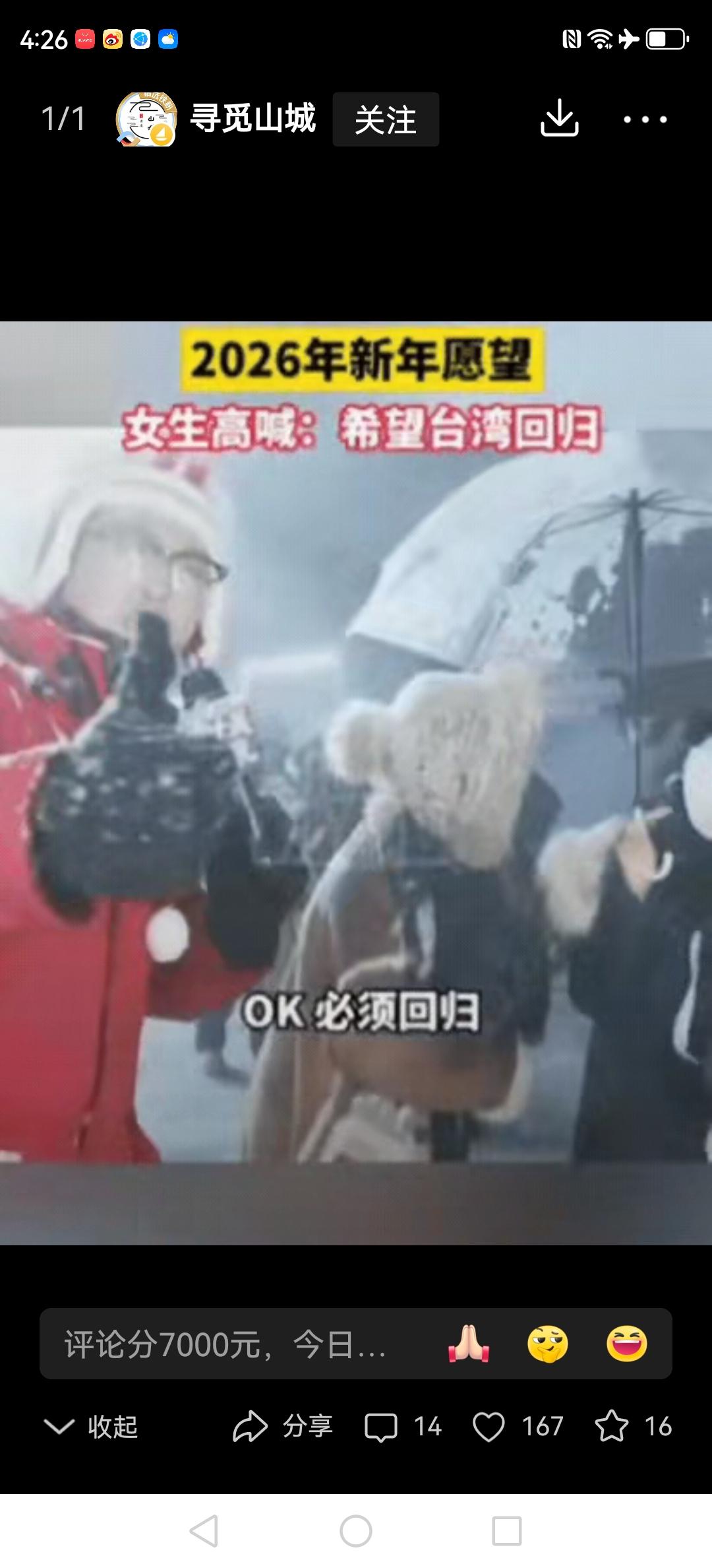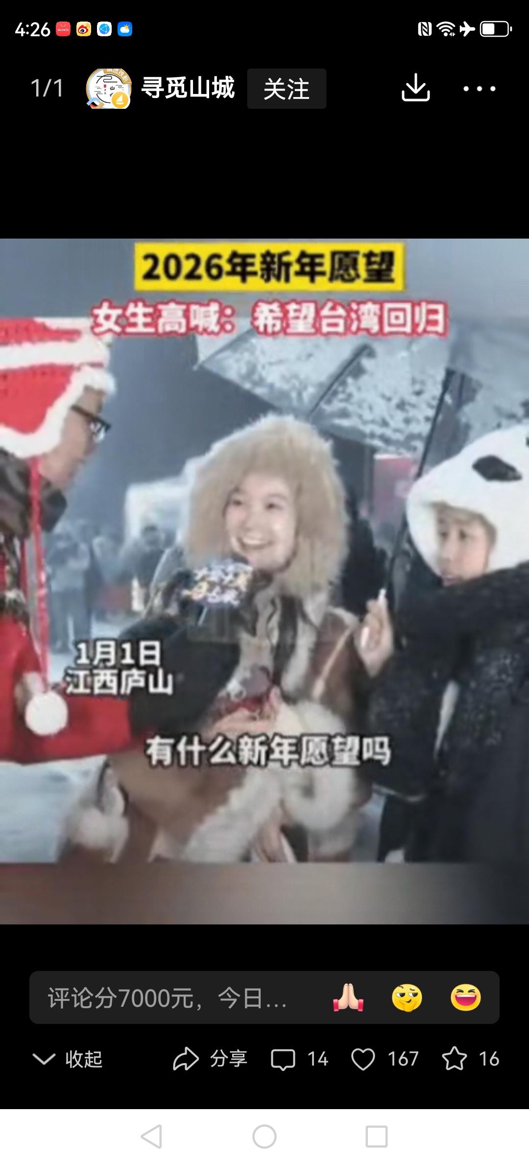 庐山的跨年现场格外热闹,有位女生在大家的欢呼声中许下新年心愿,声音一出口就点燃了全场的热情。当主持人笑着问起“新的一年有什么小小心愿呀”,她几乎是不假思索地大声说:“我希望台湾能早点回归!”这声呐喊像一颗小石子投进沸腾的湖面,主持人激动得声音都带着颤音回应:“那必须回归啊!”周围的游客们也跟着鼓起掌来,掌声里全是激动的叫好声,连空气都好像在跟着一起欢呼。 这个简单又真诚的愿望,说出了我们14亿人的心里话。跨年的现场本来就热热闹闹,有人盼着新一年能多赚点钱,有人想平平安安过好每一天,可这位姑娘用最实在的话,把心里那份沉甸甸的家国情怀全说了出来。这段视频发到网上后,大家都忍不住在评论区点赞,有人说:“这才是最让人心里一暖的新年愿望啊!” 其实啊,家国情怀从来都不是挂在嘴边的空话。它就藏在咱们普通人最实在的盼头里,是对一家人团圆的那种热望里。每一个这样小小的心愿凑到一块儿,就是推着国家走向统一的大力量。 元旦这天听到这样的话,谁听了能不跟着热血沸腾啊?台湾回归,这是大家心里最想的,也是历史早就定好的事儿。必须给这位有担当的姑娘点个大大的赞!这样的姑娘,谁听了不觉得心里亮堂堂的?庐山旅游文案 庐山心动打卡地 雪景庐山 庐山幻景 庐山冰景 庐山跨年晚会 庐山跨年音乐节
