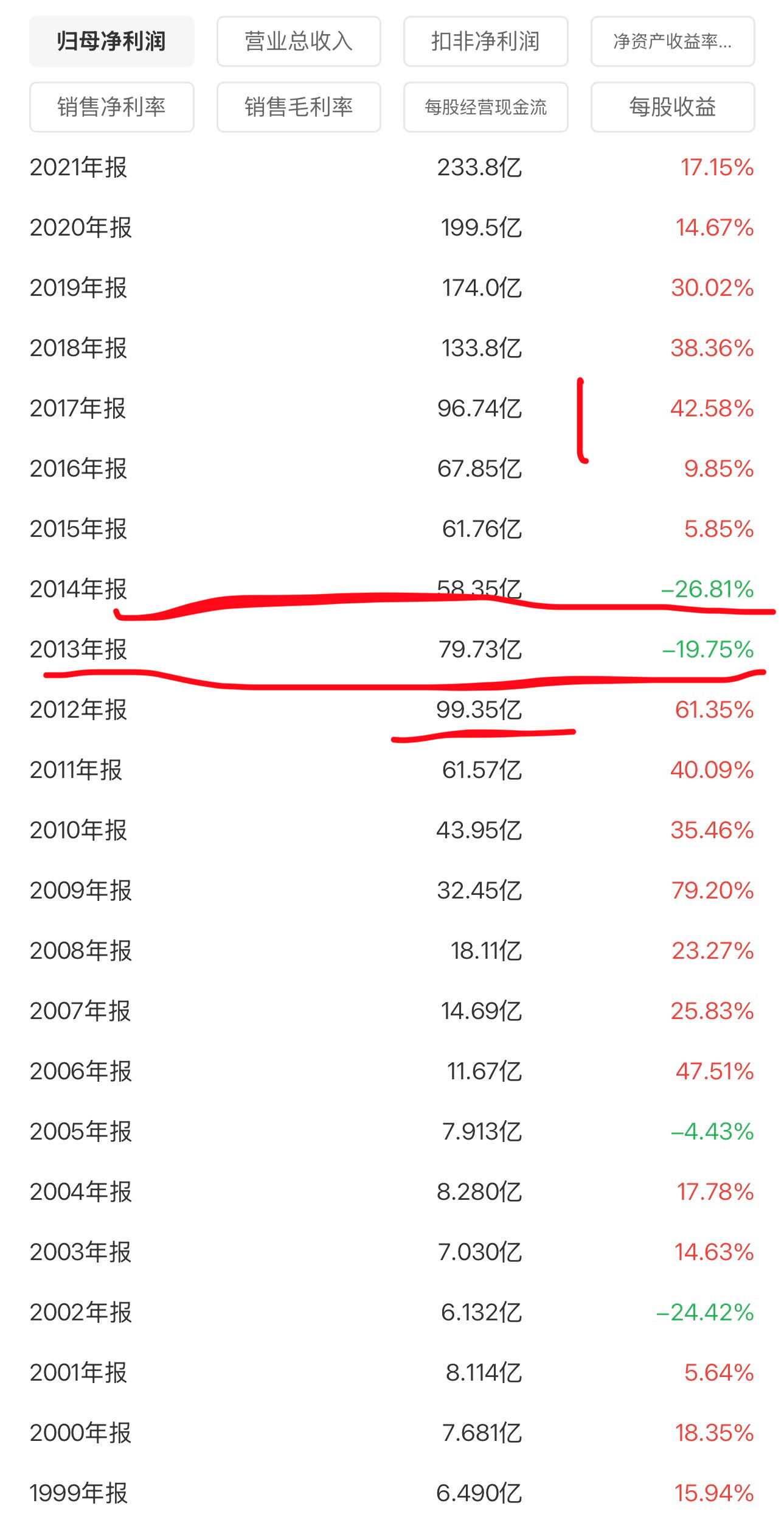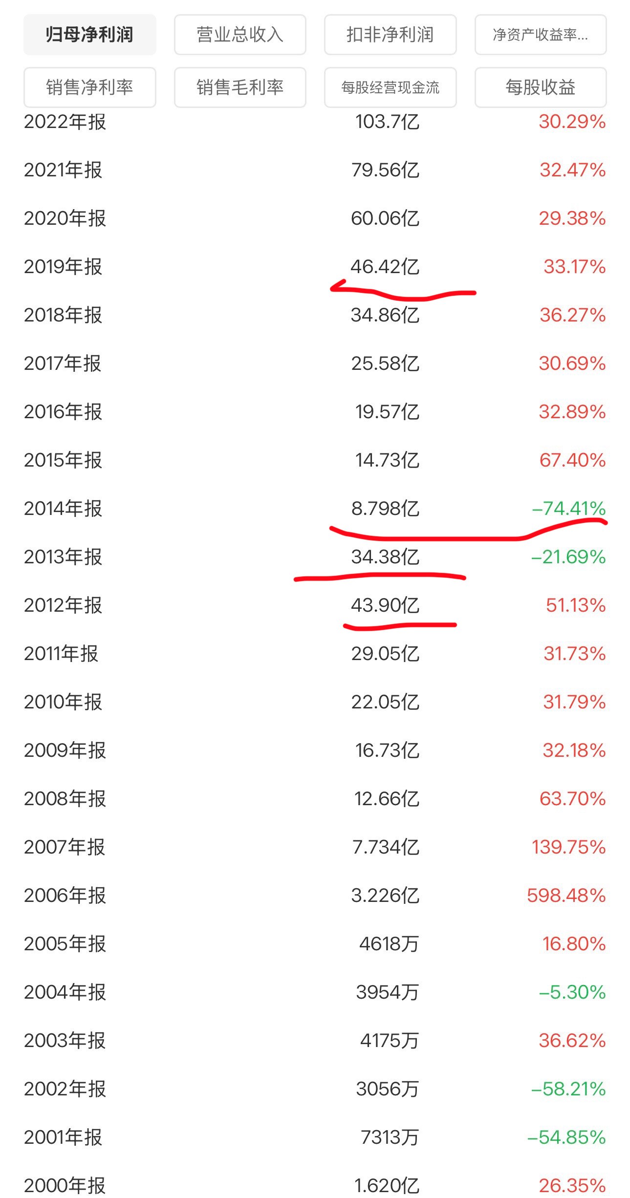 2025年白酒业绩下滑是肯定的,2026年业绩还会下滑。这不是第一次,也不是最后一次,白酒股一直有周期。煤炭、石油、黄金等等都如此。2013年~2014年的白酒业绩比2025年惨多了,2013年股价也惨。图一是五粮液业绩图,2013年净利润同比减少19.75亿,2014年同比减少26.81%。到了2017年五粮液净利润才超过2012年。图二是泸州老窖业绩图。2013年净利润同比减少21.69%,2014年同比减少74.41%。到了2019年净利润才超过2012年,花了7年时间利润才再创新高。虽然2014年白酒业绩很惨,但已经是市场预期内的了,虽然2014年泸州老窖净利润同比大跌74.41%,但泸州老窖2014年股价是上涨的,2014年泸州老窖股价涨5.79%,2014年五粮液股价涨37.91%,2014年茅台股价涨57.68%。为什么2014年白酒业绩大跌,股价反而上涨了呢。因为股价提前跌了。而且2014年的业绩大减是为了2015年业绩增长做准备。所以2025年白酒业绩下跌,我觉得2026年白酒业绩还会下跌,但股价不一定会跌。如果跌了,也不是坏事,那2027年就是好年份了。