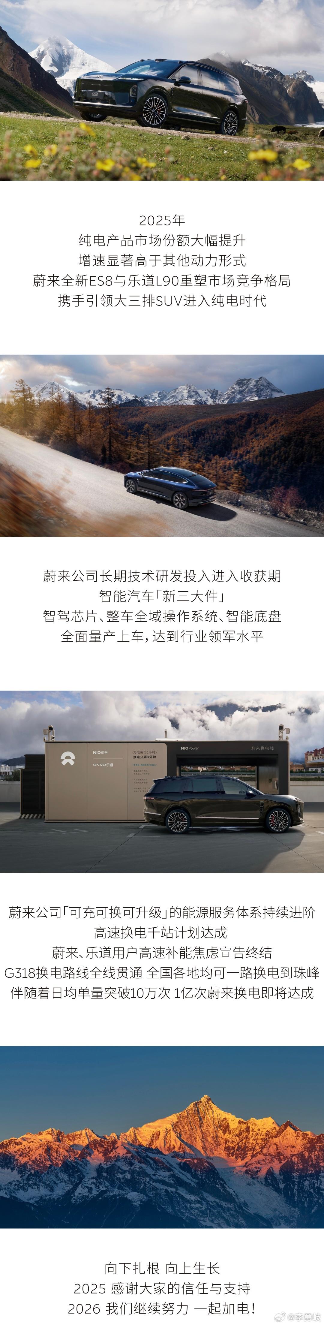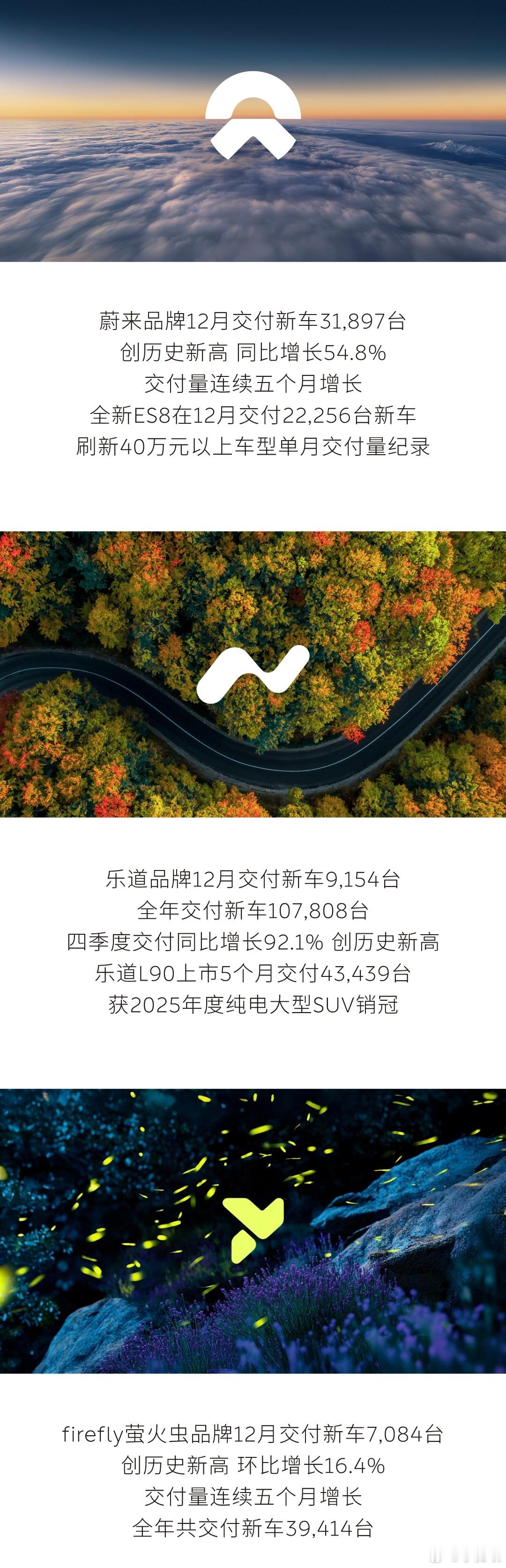 2025年12月,蔚来公司交付新车48,135台,创历史新高!其中,蔚来品牌交付31,897台,乐道品牌交付新车9,154台,firefly萤火虫品牌交付新车7,084台。2025年全年,蔚来公司共交付新车326,028台,创历史新高,同比增长46.9%。其中,蔚来品牌共交付178,806台。乐道品牌共交付107,808台。firefly萤火虫品牌交付39,414台。乐道全年交付破10万具体乐道品牌来看,乐道L90上市5个月累计交付超4.3万台,成为2025年度纯电大型SUV销冠,并带动品牌成交均价达到25万+,看齐传统豪华品牌,位列新势力品牌第一梯队,实现“量价齐升”。政策退坡,乐道这种租电模式的车型的春天来了!租电买车先减8万多,支持车电分离计税,在5%的基础上能再省最高近4000元。这两天下单还有跨年福利,新年开新车,不得不说1月是购买乐道的最佳时机!2026马上乐道
