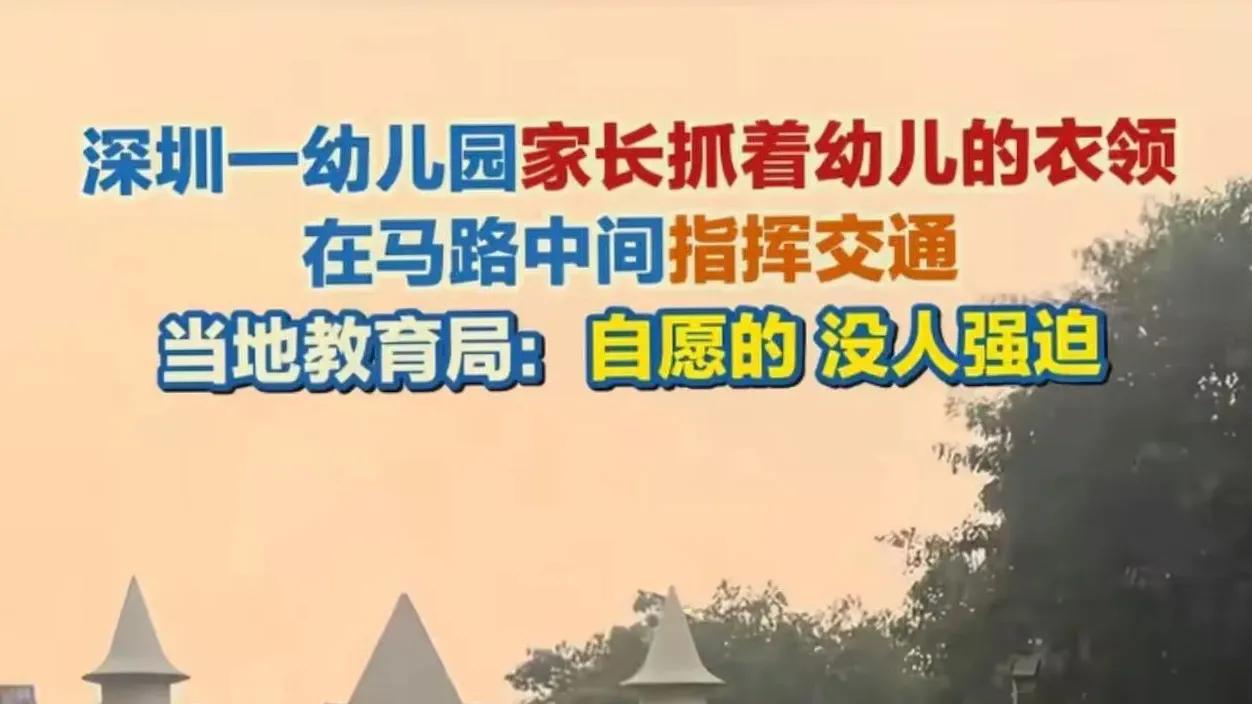 深圳的一幼儿园,家长抓着幼儿的衣领,在马路中间指挥交通,被网友拍下发到网上质问: