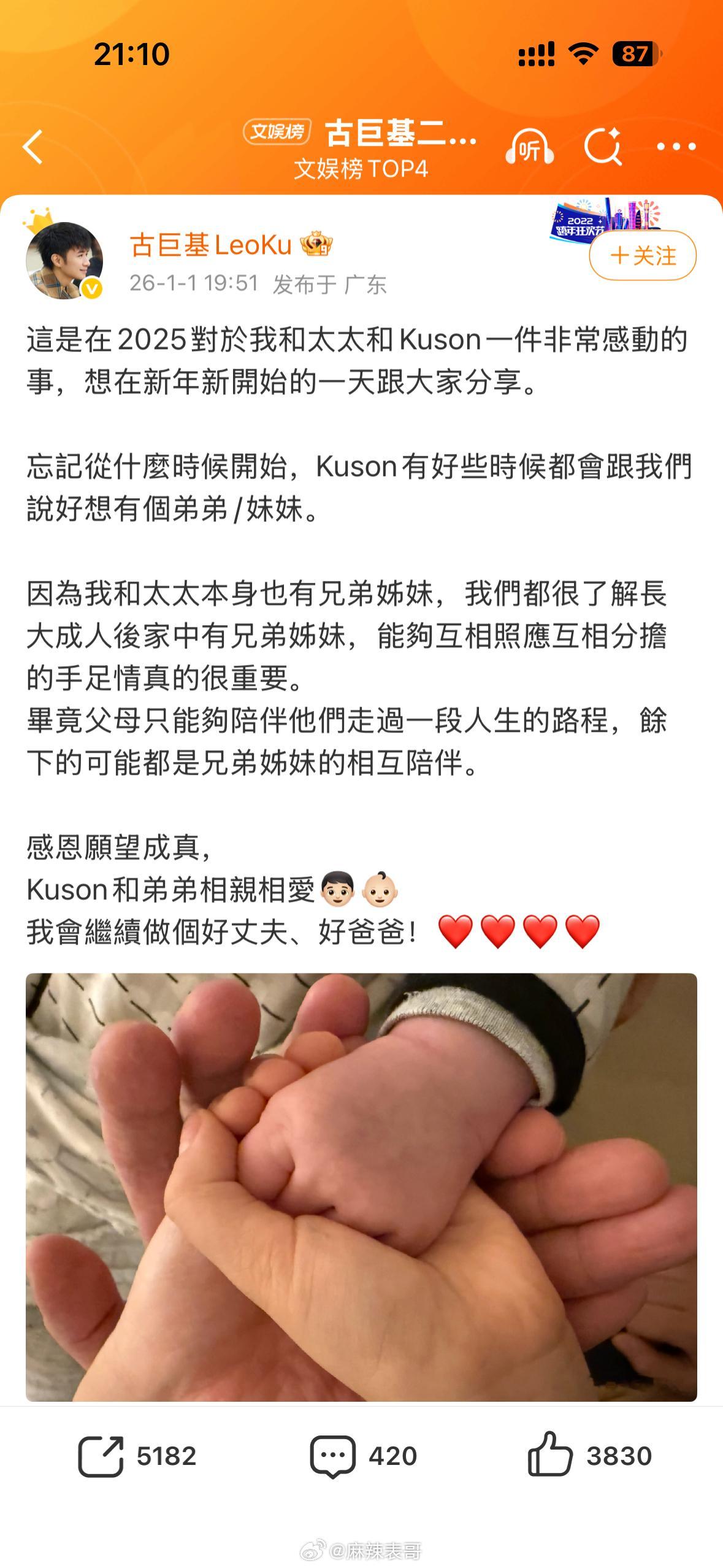 古巨基二胎出生了,古巨基和老婆陈韵晴2014年结婚,2020年3月大儿子Kuson出生。现在网友在骂他,因为他老婆大他4岁,现在已经58岁了。