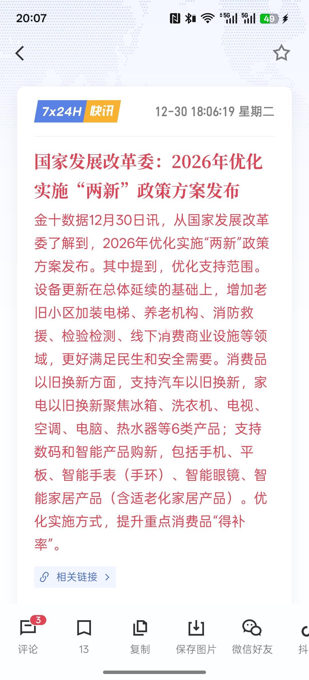两部门:2026年个人消费者购买手机、平板、智能手表手环、智能眼镜等4类产品 按产品销售价格的15%给予补贴。 一次国家补贴还是相对比较高的,国补总共600多亿,包括在新能源汽车的补贴,以旧换新,包括在报废领域也给出了相对的补贴,那在各方面电子消费产品方面同样给出了国补政策,让未来在更换电子设备,消费产品同样可以带动消费市场的活力,那在汽车方面明年大概率依然是一个相对比较有增长预期的行情走势,至少明年在自动驾驶技术L3的商用落地,那后续依然可以开启一次大的消费市场继续换车消费市场!