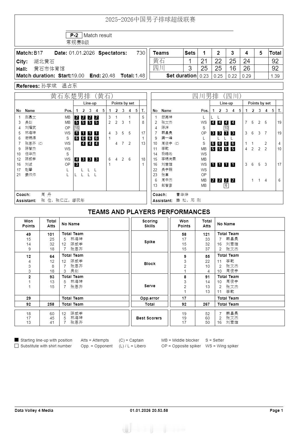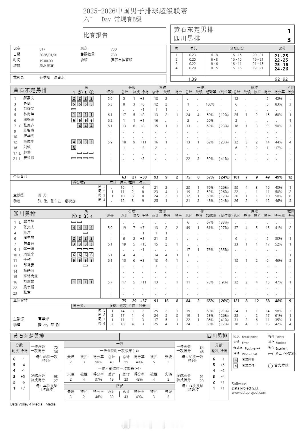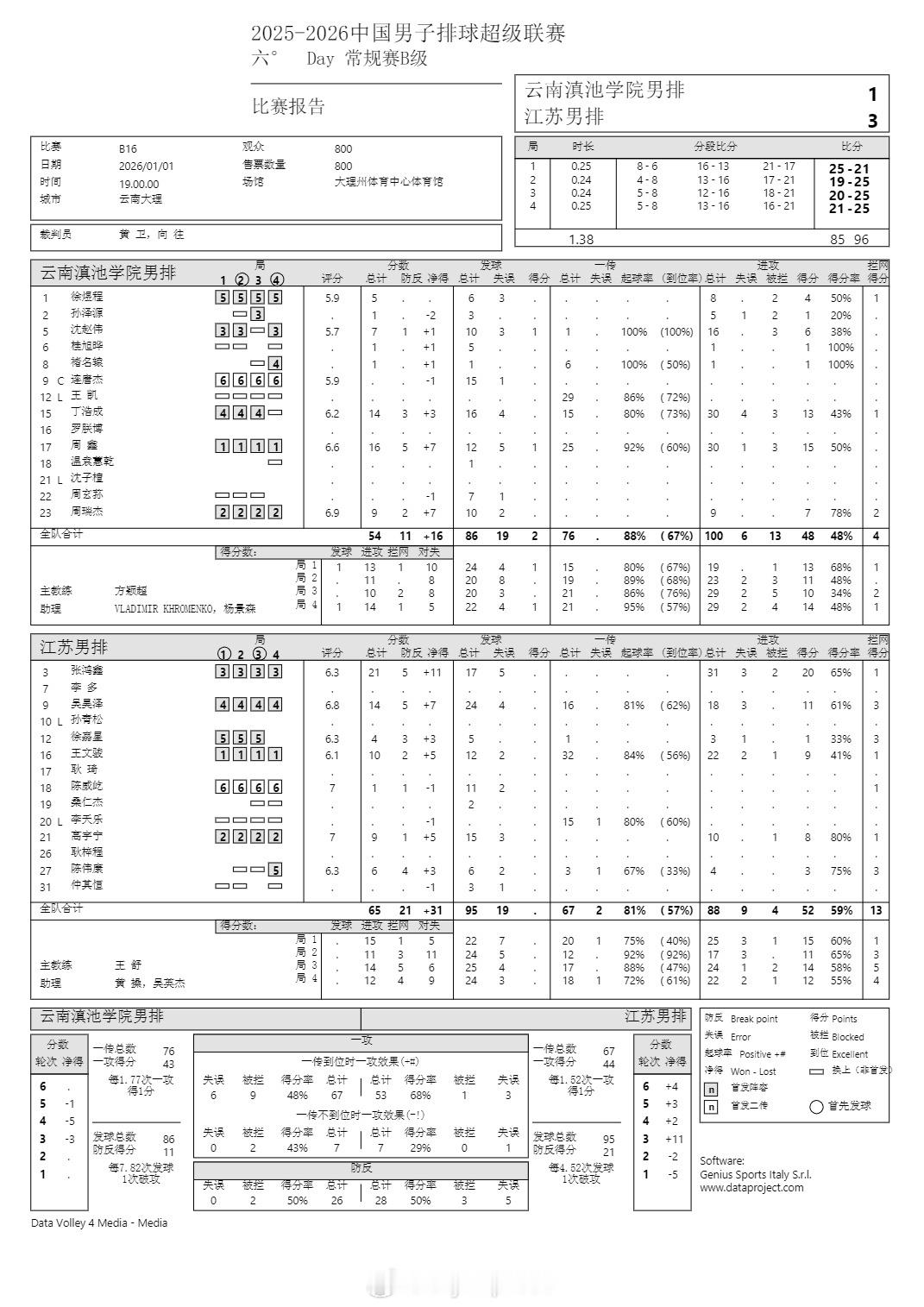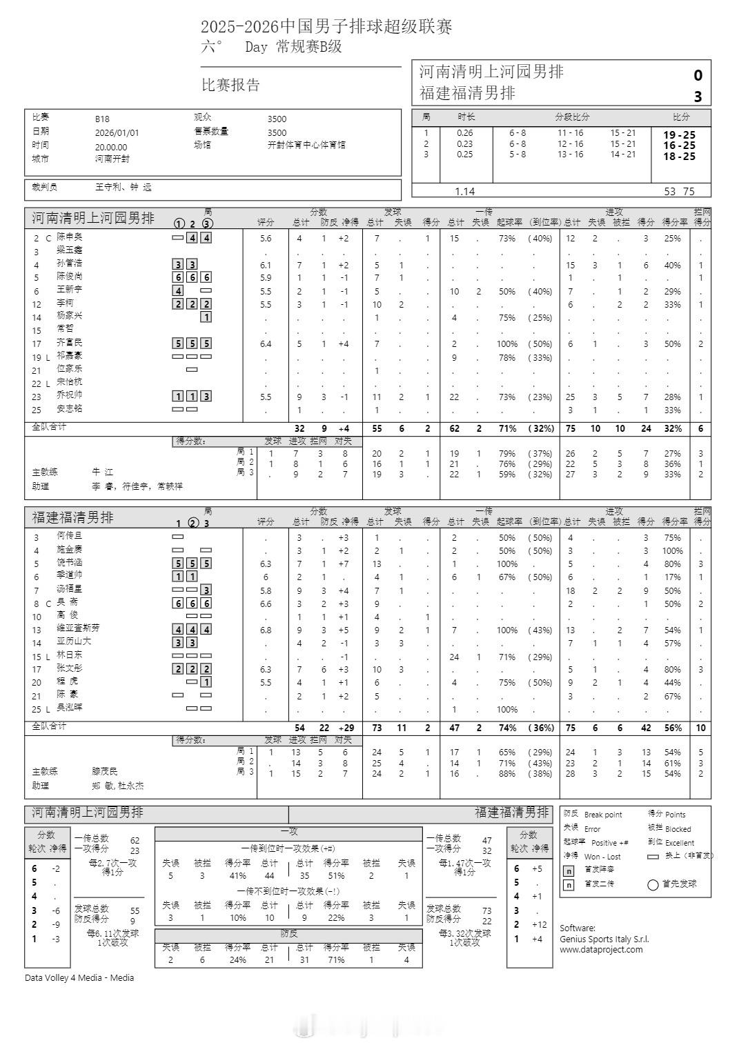 排超联赛 1月1日,男排联赛第六轮三场B级赛技术统计。
