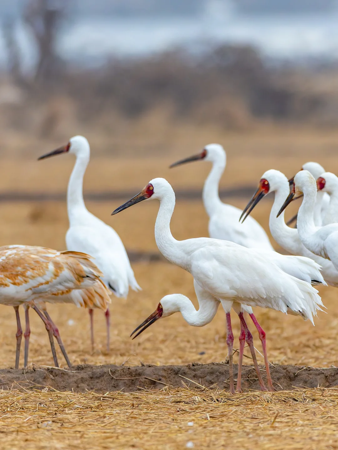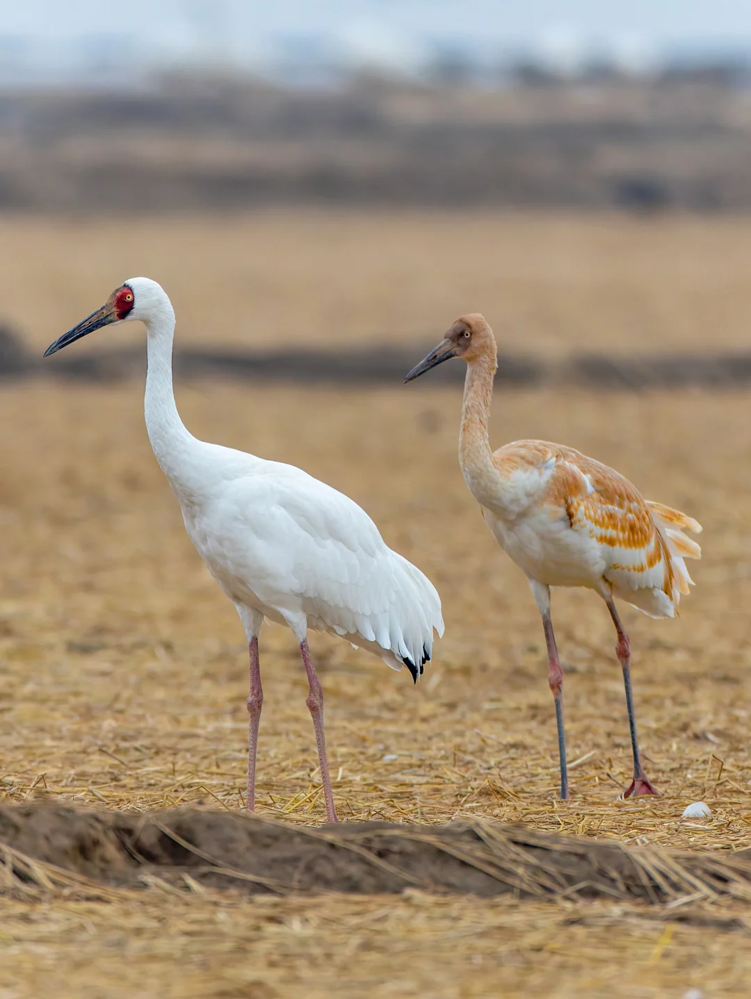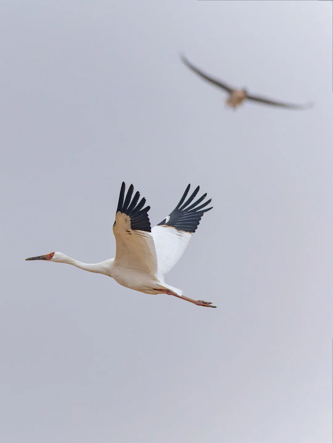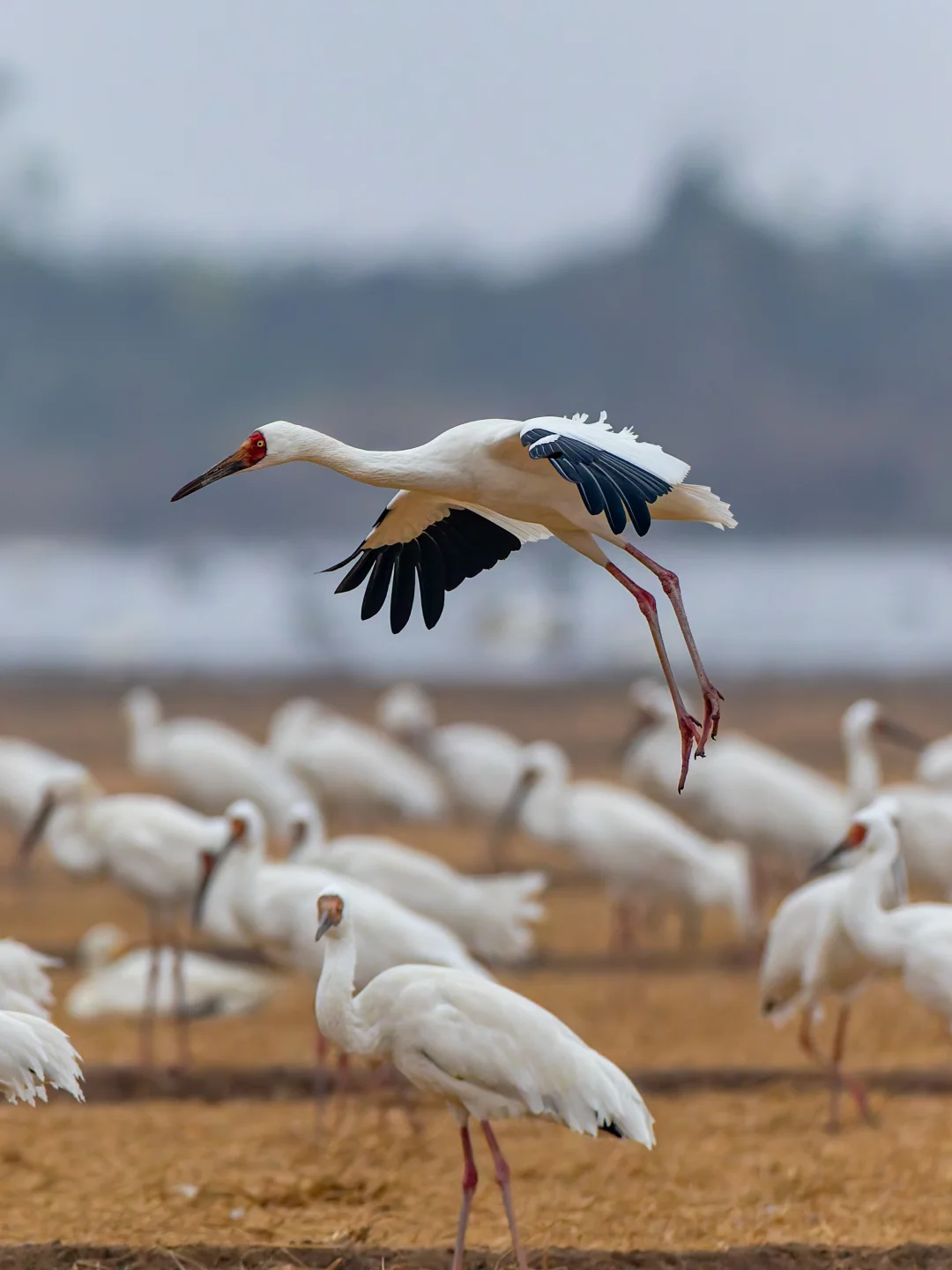 白鹤通体白色,翼端深黑色,脸部是鲜红,嘴赭红色,特征明显。幼鸟p2头颈背翅膀浅棕色。黄色虹膜。这个季节到鄱阳湖,很容易看到这种美丽的鹤类。