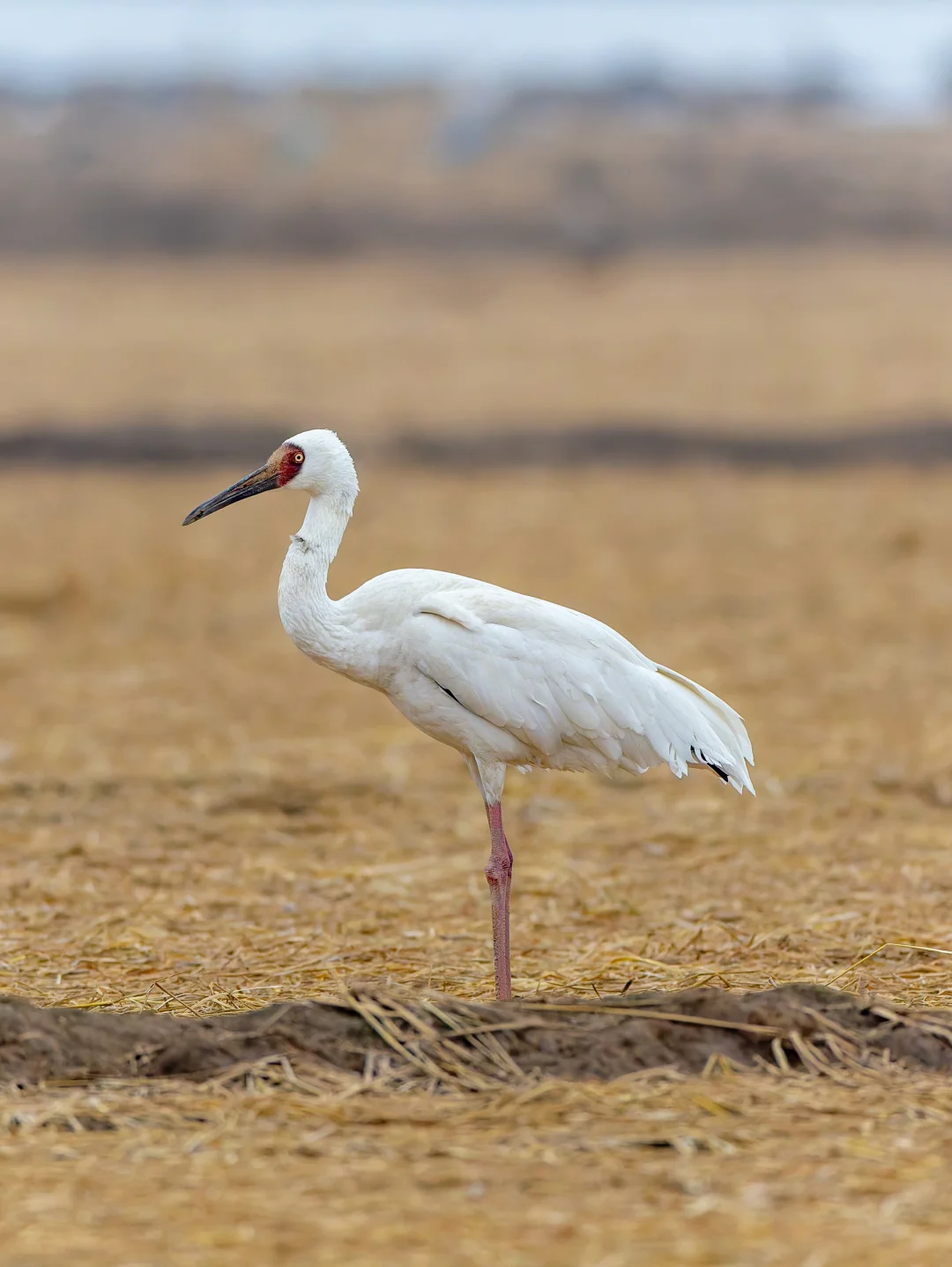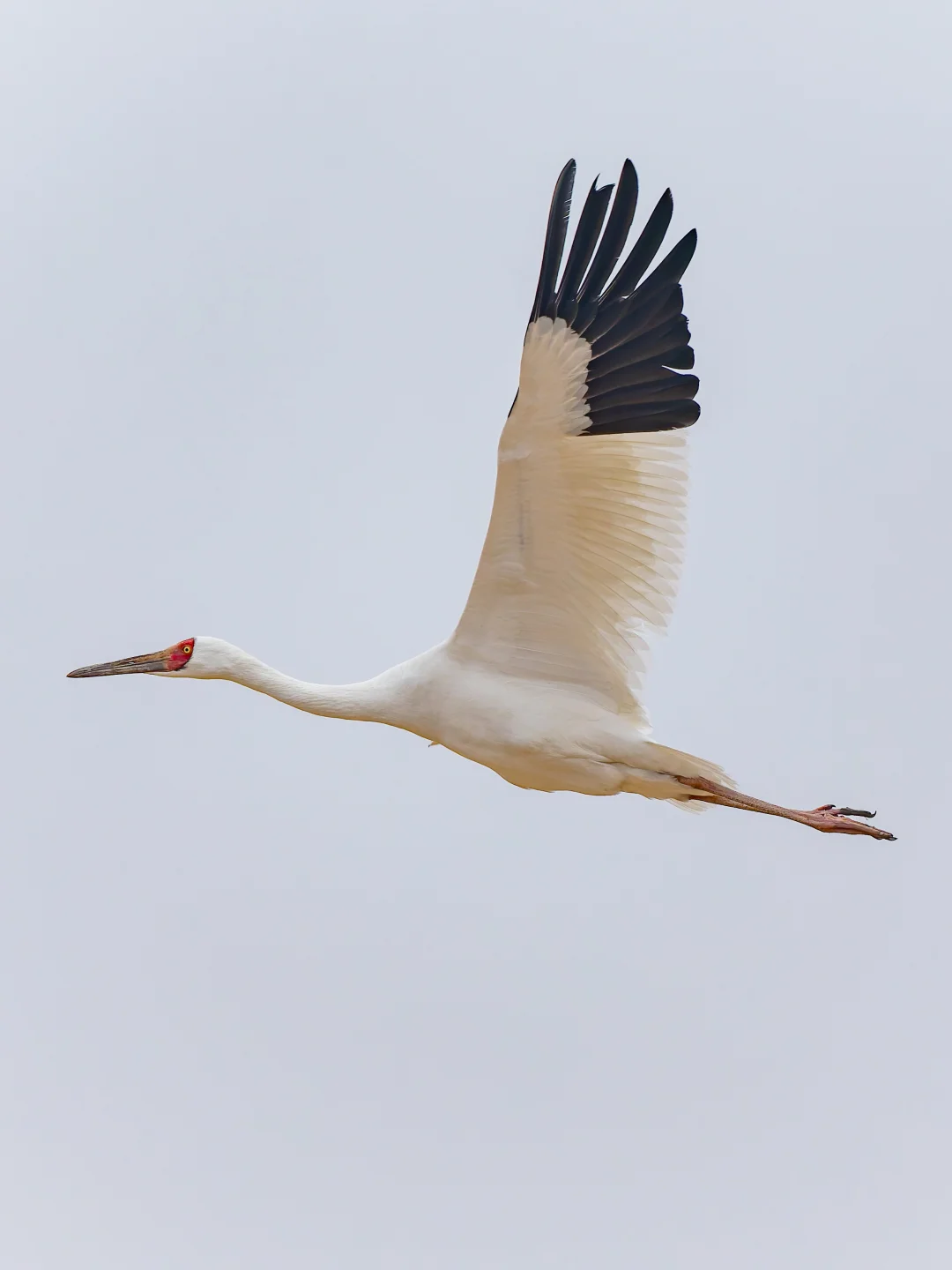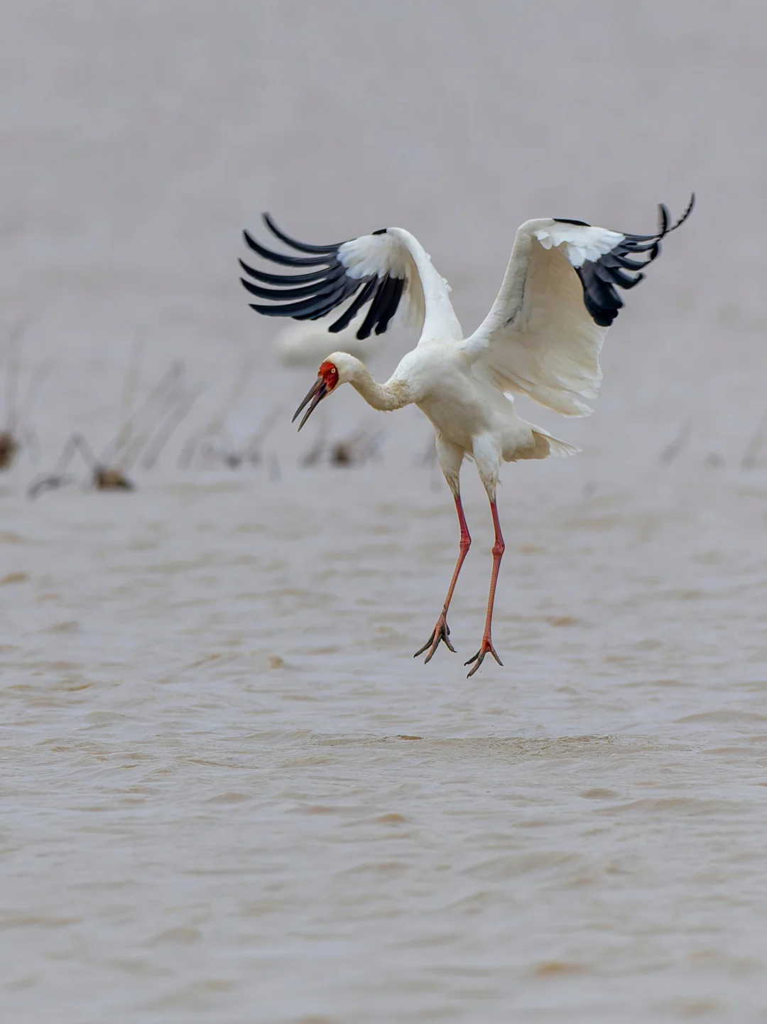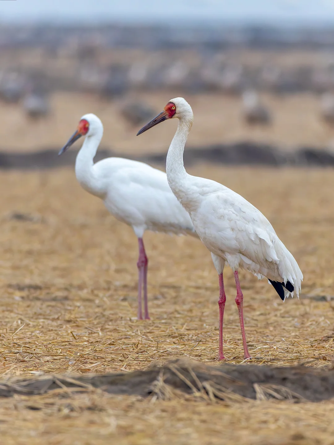 白鹤通体白色,翼端深黑色,脸部是鲜红,嘴赭红色,特征明显。幼鸟p2头颈背翅膀浅棕色。黄色虹膜。这个季节到鄱阳湖,很容易看到这种美丽的鹤类。