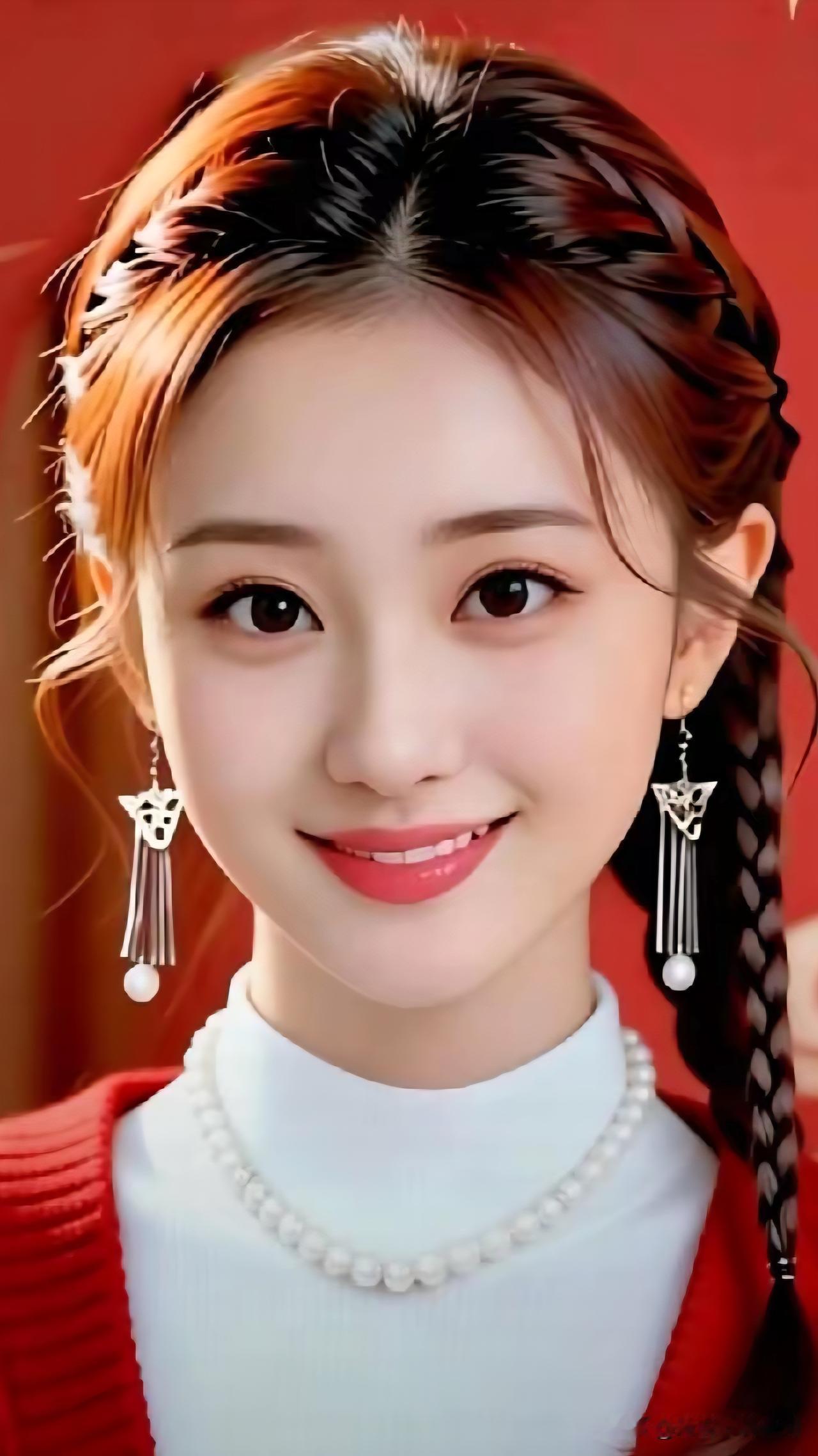 红妆美人笑,珠光玉露妆。你看到过最美的壁纸吗 甜美笑容,红发编辫,珍珠项链,优雅气质,红衣白衫,时尚搭配,美丽动人。