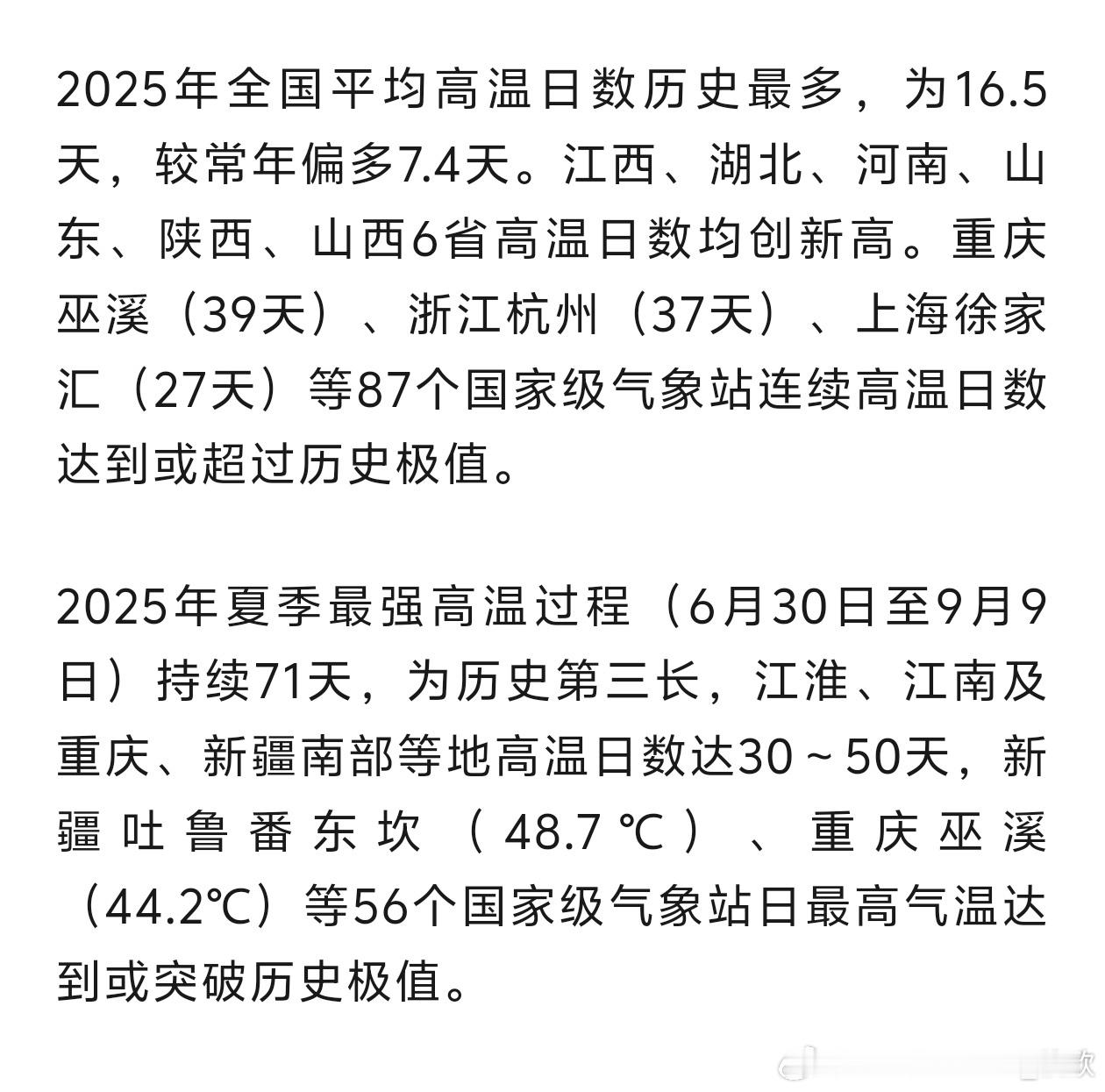 【又是最暖热的一年】今晚国家气候中心给出的年度报告,2025年我国平均气温11℃,较常年偏高1.1℃,超过2024年10.9℃,再创1961年以来最高纪录!新疆、辽宁、河北、江西、湖北、山东、天津、西藏、湖南、河南、吉林、上海、陕西、安徽、浙江、江苏共16个省(市、区)气温均为1961年以来历史最高。2025年全国平均高温日数历史最多,为16.5天,较常年偏多7.4天。江西、湖北、河南、山东、陕西、山西6省高温日数均创新高。重庆巫溪(39天)、浙江杭州(37天)、上海徐家汇(27天)等87个国家级气象站连续高温日数达到或超过历史极值。2025年夏季,吐鲁番东坎(48.7℃)、重庆巫溪(44.2℃)等56个国家级气象站日最高气温达到或突破历史极值。2025年秋季江南、华南北部接连出现大范围“秋老虎”高温过程(9月11-18日、10月1-12日),全国共419个国家级气象站刷新当地最晚高温日纪录。