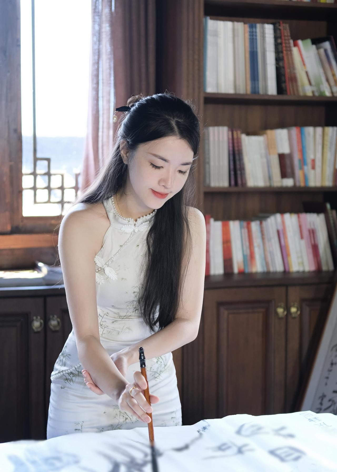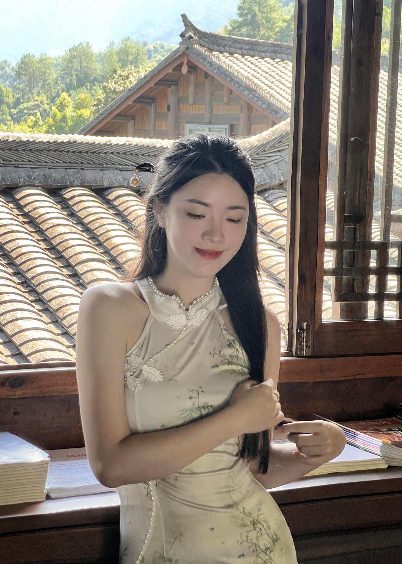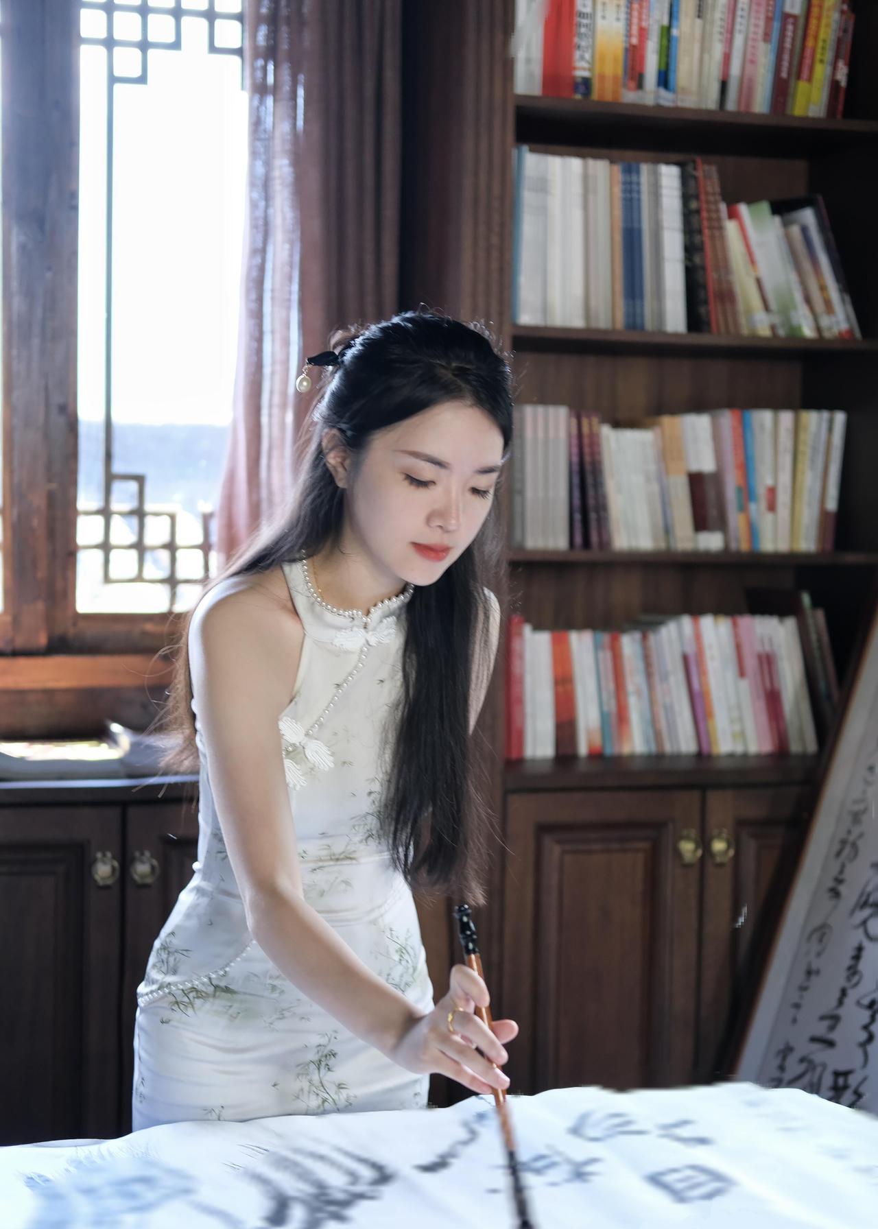 山中小院的笔墨时光|旗袍与中式美学的温柔相遇 躲进山里的中式小院写字,才真正体会到什么叫“偷得浮生半日闲”。 推开木门走进书房的那一刻,就被满室的墨香和木头纹理裹住了,连呼吸都慢了下来。 特意选了件白色无袖旗袍来配这个场景,面料是哑光的缎面,贴在身上软软的不紧绷,裙身印着浅青色的竹纹,细细的线条顺着身形蜿蜒,和窗外的青山翠竹刚好呼应。 领口的珍珠镶边是点睛之笔,阳光斜斜照过来时,珍珠会泛着细碎的光,不会太张扬,却让素色旗袍多了点精致感。 无袖的设计刚好露出胳膊,写字时抬腕落笔也不会被面料束缚,原来旗袍也能穿得这么自在,不是刻板印象里的拘谨,而是柔中带刚的舒展。 铺好宣纸,沾了墨汁的毛笔落在纸上时,笔尖的软韧感一下子就传到手心。 书桌旁立着的书法卷轴,墨色浓淡交错,和我笔下的墨迹晕开的样子像极了;身后的木质书架塞得满满当当,彩色的书脊在深棕色的木头衬托下,倒成了书房里一抹鲜活的亮色,不会让整个空间显得太沉闷。 写累了就靠在窗边站着,雕花的木窗棂把窗外的景色框成了一幅画——青灰色的瓦檐层层叠叠,远处的青山披着绿衣,白云绕着山尖慢悠悠飘,风穿过窗缝吹进来,带着竹子的清冽味,连墨香都变得清甜了。 抬手理头发时,才发现发间别着的小玉簪刚好和旗袍的竹纹搭调,这些不经意的小细节,倒让整个穿搭和环境融在了一起。 其实中式美学从来不是硬邦邦的规矩,而是这样的松弛感:穿一件合心意的旗袍,握一支毛笔在宣纸上随意挥洒,窗外是山,屋内是墨,时光好像被拉得很长很长。 临走时回头看了眼书房,阳光还在宣纸上游走,墨迹已经干了大半,旗袍的竹纹在光影里若隐若现。 原来最动人的美,从来都是人与自然、与器物的温柔相融,就像这支毛笔遇上宣纸,就像这件旗袍遇上这方山中小院,妥帖又舒服。旗袍庭院照 中式温婉韵
