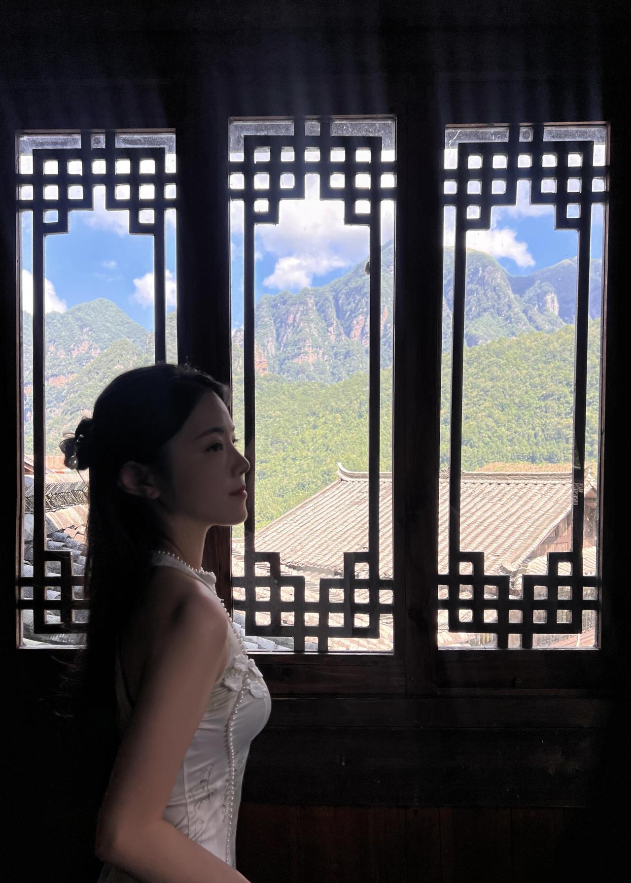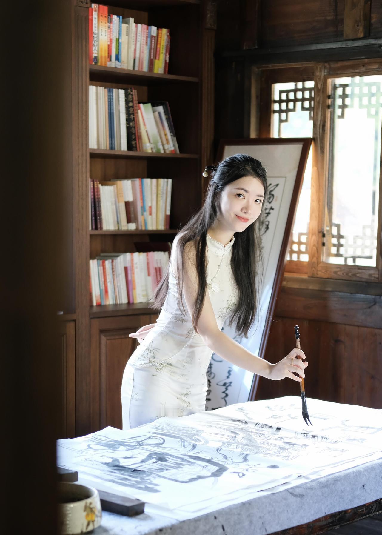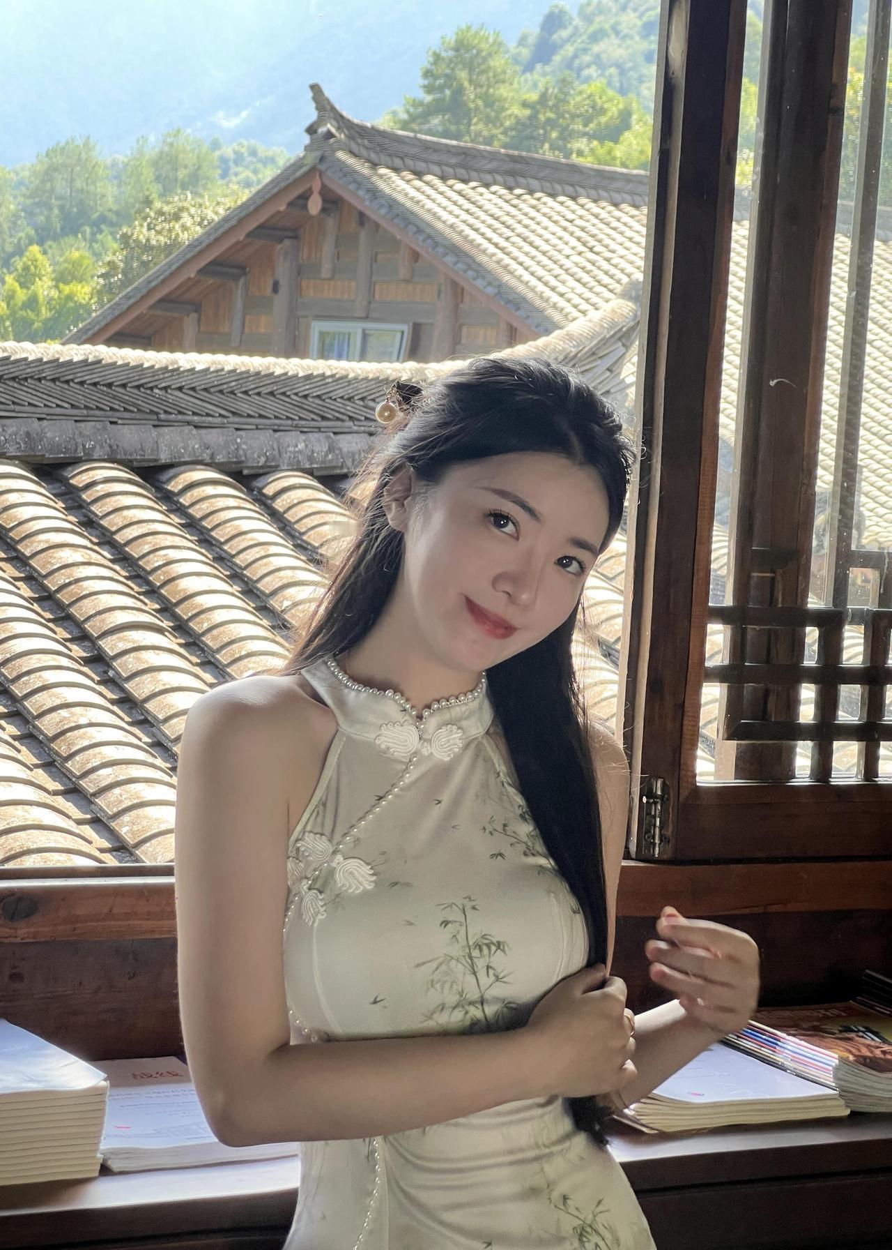 山中小院的笔墨时光|旗袍与中式美学的温柔相遇 躲进山里的中式小院写字,才真正体会到什么叫“偷得浮生半日闲”。 推开木门走进书房的那一刻,就被满室的墨香和木头纹理裹住了,连呼吸都慢了下来。 特意选了件白色无袖旗袍来配这个场景,面料是哑光的缎面,贴在身上软软的不紧绷,裙身印着浅青色的竹纹,细细的线条顺着身形蜿蜒,和窗外的青山翠竹刚好呼应。 领口的珍珠镶边是点睛之笔,阳光斜斜照过来时,珍珠会泛着细碎的光,不会太张扬,却让素色旗袍多了点精致感。 无袖的设计刚好露出胳膊,写字时抬腕落笔也不会被面料束缚,原来旗袍也能穿得这么自在,不是刻板印象里的拘谨,而是柔中带刚的舒展。 铺好宣纸,沾了墨汁的毛笔落在纸上时,笔尖的软韧感一下子就传到手心。 书桌旁立着的书法卷轴,墨色浓淡交错,和我笔下的墨迹晕开的样子像极了;身后的木质书架塞得满满当当,彩色的书脊在深棕色的木头衬托下,倒成了书房里一抹鲜活的亮色,不会让整个空间显得太沉闷。 写累了就靠在窗边站着,雕花的木窗棂把窗外的景色框成了一幅画——青灰色的瓦檐层层叠叠,远处的青山披着绿衣,白云绕着山尖慢悠悠飘,风穿过窗缝吹进来,带着竹子的清冽味,连墨香都变得清甜了。 抬手理头发时,才发现发间别着的小玉簪刚好和旗袍的竹纹搭调,这些不经意的小细节,倒让整个穿搭和环境融在了一起。 其实中式美学从来不是硬邦邦的规矩,而是这样的松弛感:穿一件合心意的旗袍,握一支毛笔在宣纸上随意挥洒,窗外是山,屋内是墨,时光好像被拉得很长很长。 临走时回头看了眼书房,阳光还在宣纸上游走,墨迹已经干了大半,旗袍的竹纹在光影里若隐若现。 原来最动人的美,从来都是人与自然、与器物的温柔相融,就像这支毛笔遇上宣纸,就像这件旗袍遇上这方山中小院,妥帖又舒服。旗袍庭院照 中式温婉韵
